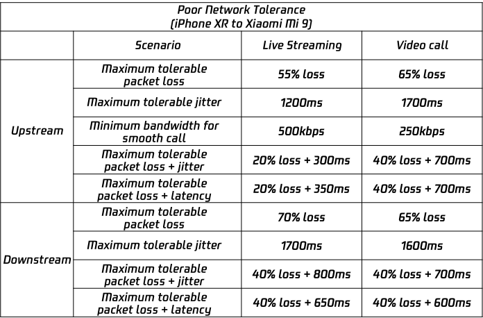 극한 멀티미디어 저항력 테스트 표준 | 네트워크 손실 후 Spirent Nomad 디바이스를 사용한 POLQA 점수와 foreman을 사용한 비디오를 순서대로 발송하여 수신측에서 프레임 간격을 검증합니다. 10분 이상 모니터링을 지속하며 30개의 데이터 지점을 획득합니다. 3분 동안 3회 이상 오류가 감지되거나 비교적 긴 시간 동안 사용할 수 없는 현상이 1회 발생할 경우 저항력이 초과되었다고 볼 수 있습니다. |