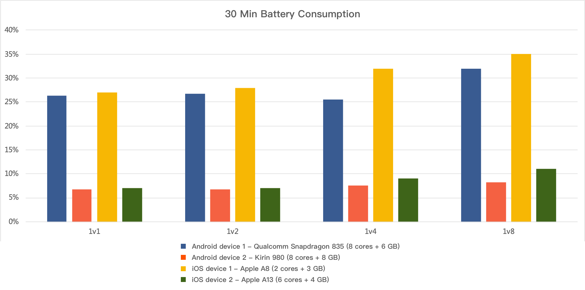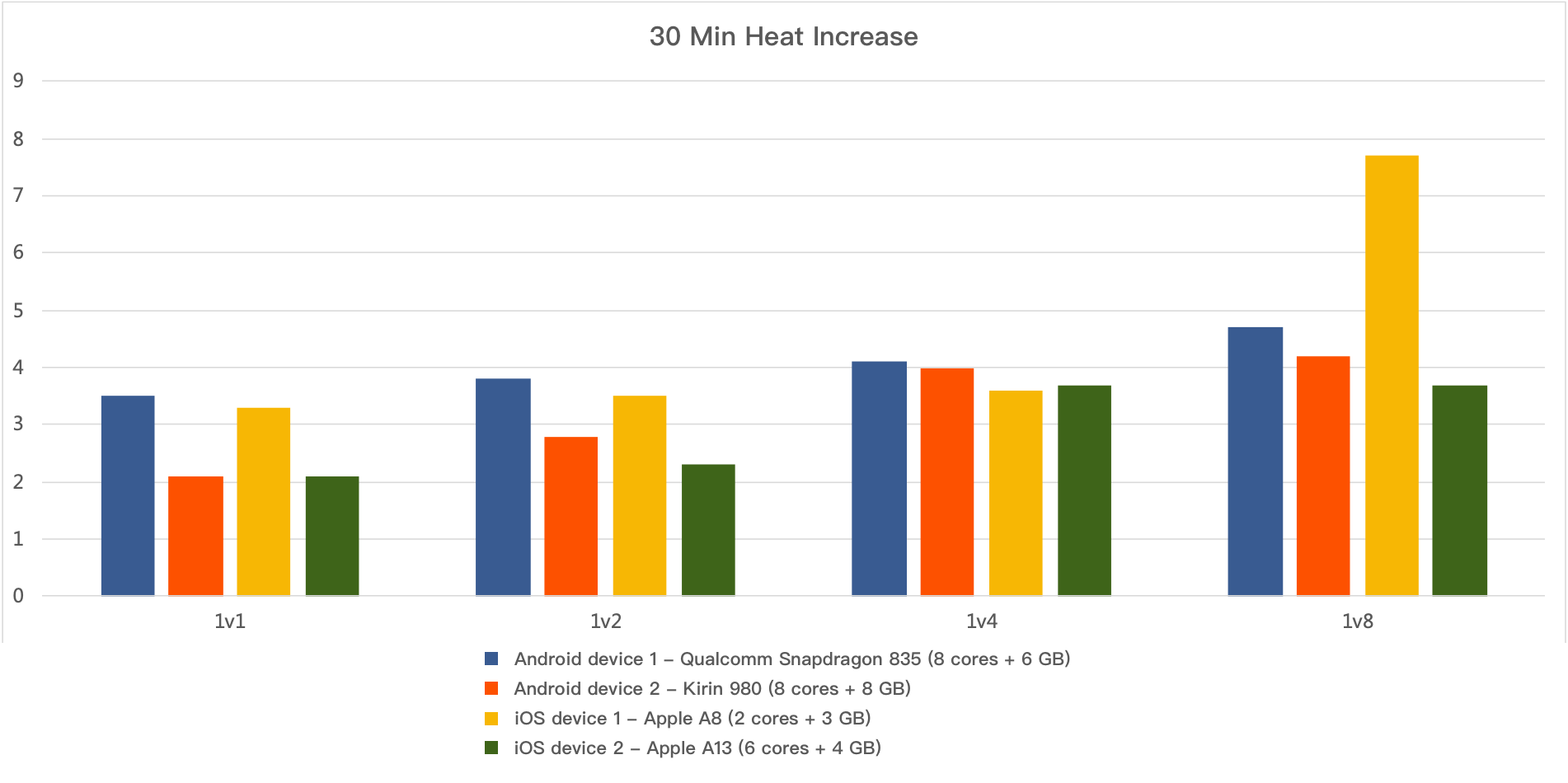 발열 증분 | App을 실행하지 않은 상태에서 온도계로 현재 온도를 측정하고, App 실행 후 시나리오마다 30분간 실행합니다. 발열 증분 = 30분 후의 온도 - App을 실행하지 않았을 때의 온도. | |