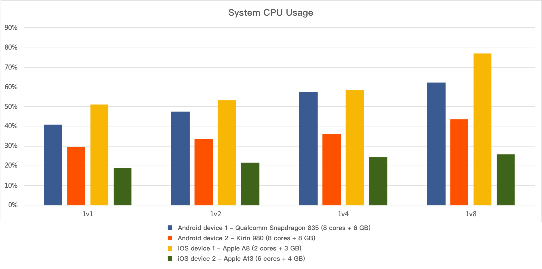 시스템 CPU 사용률 | Android | Total CPU는 기기에서 CPU 사용률을 표준화하지 않았음을 의미합니다. 통계 결과는 Android Studio Profiler와 일치합니다. |