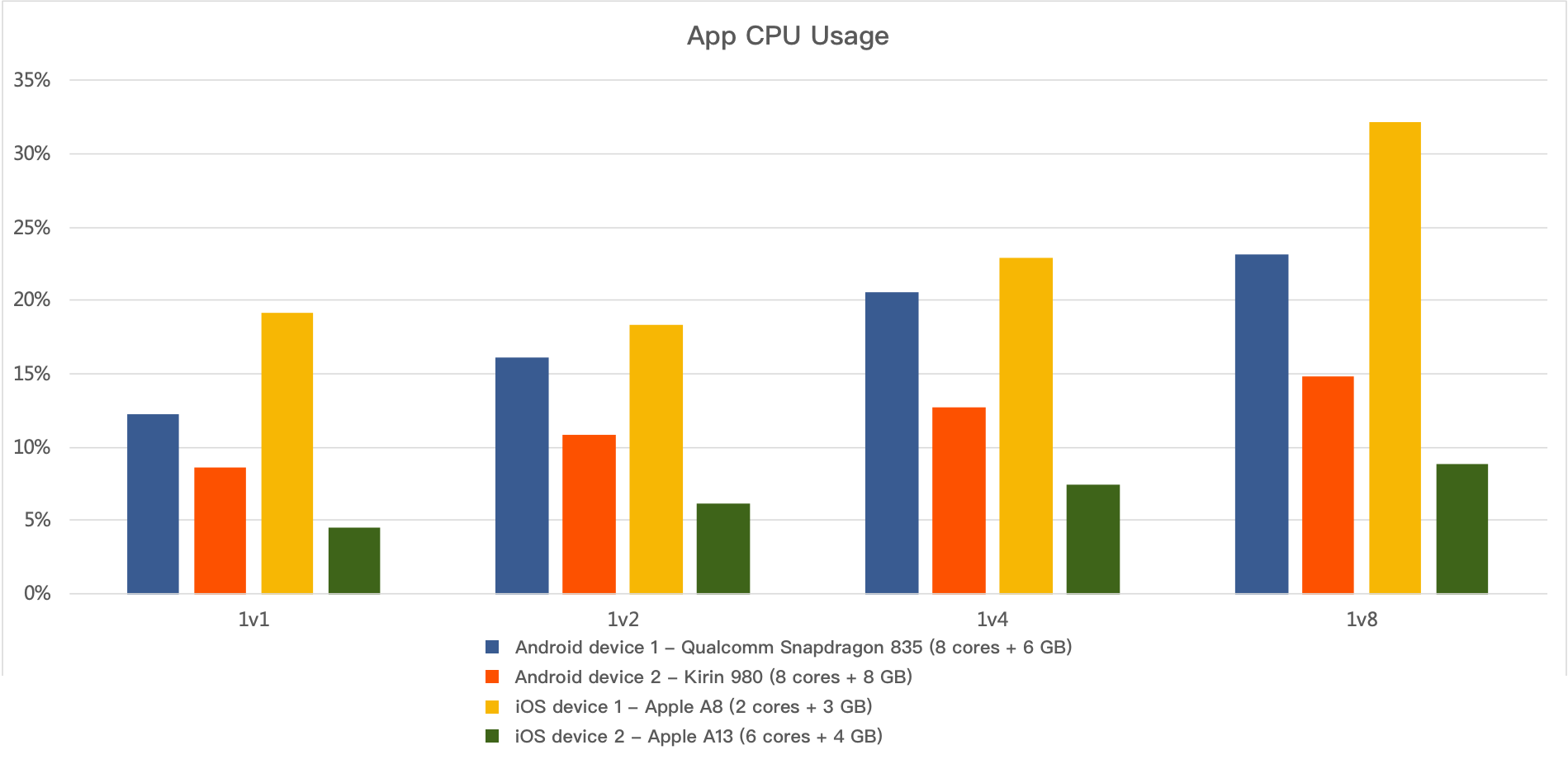 App CPU 사용률 | Android | App CPU는 프로세스에서 CPU 사용률을 표준화하지 않았음을 의미합니다. 통계 결과는 Android Studio Profiler와 일치합니다. |