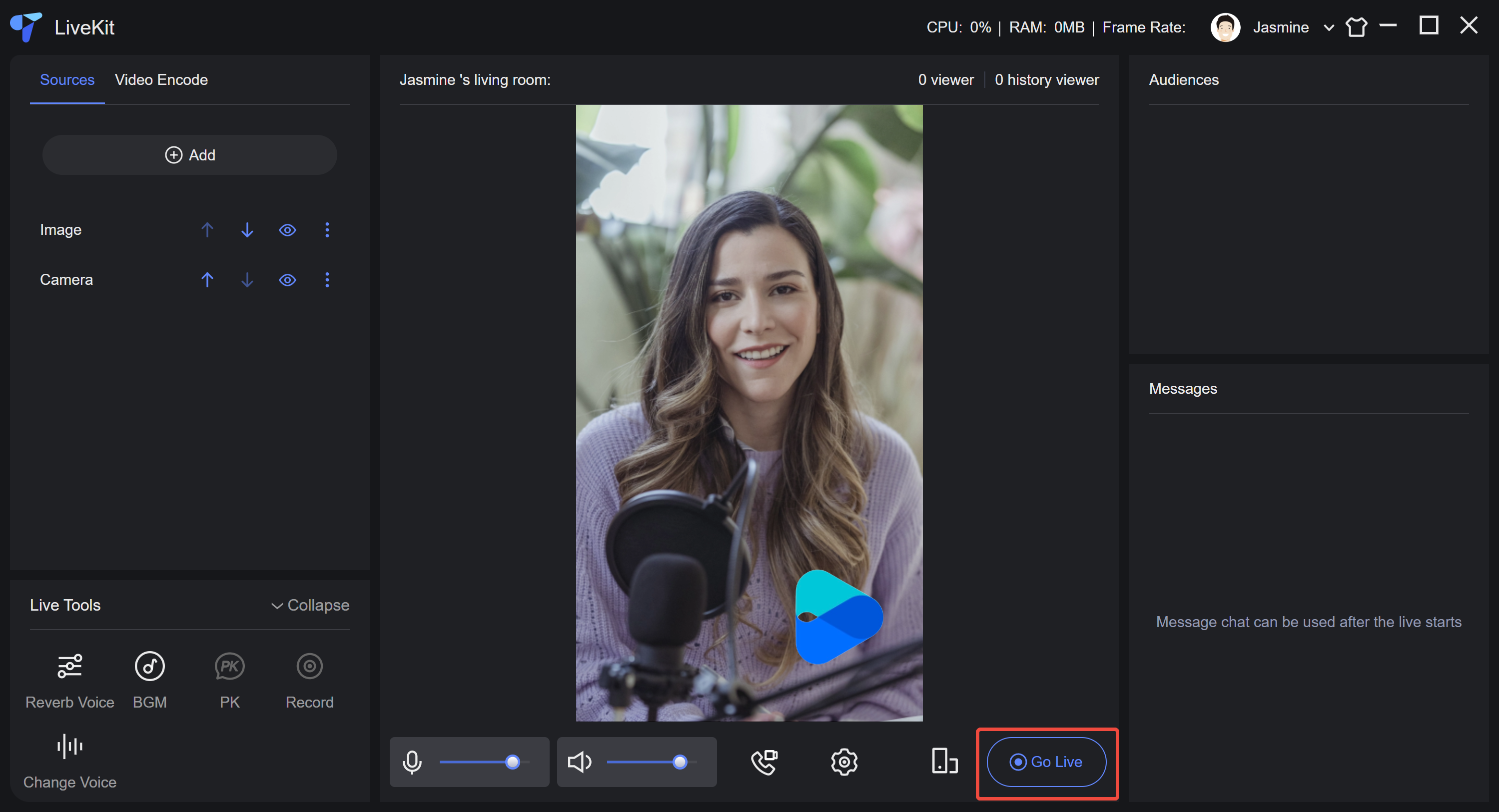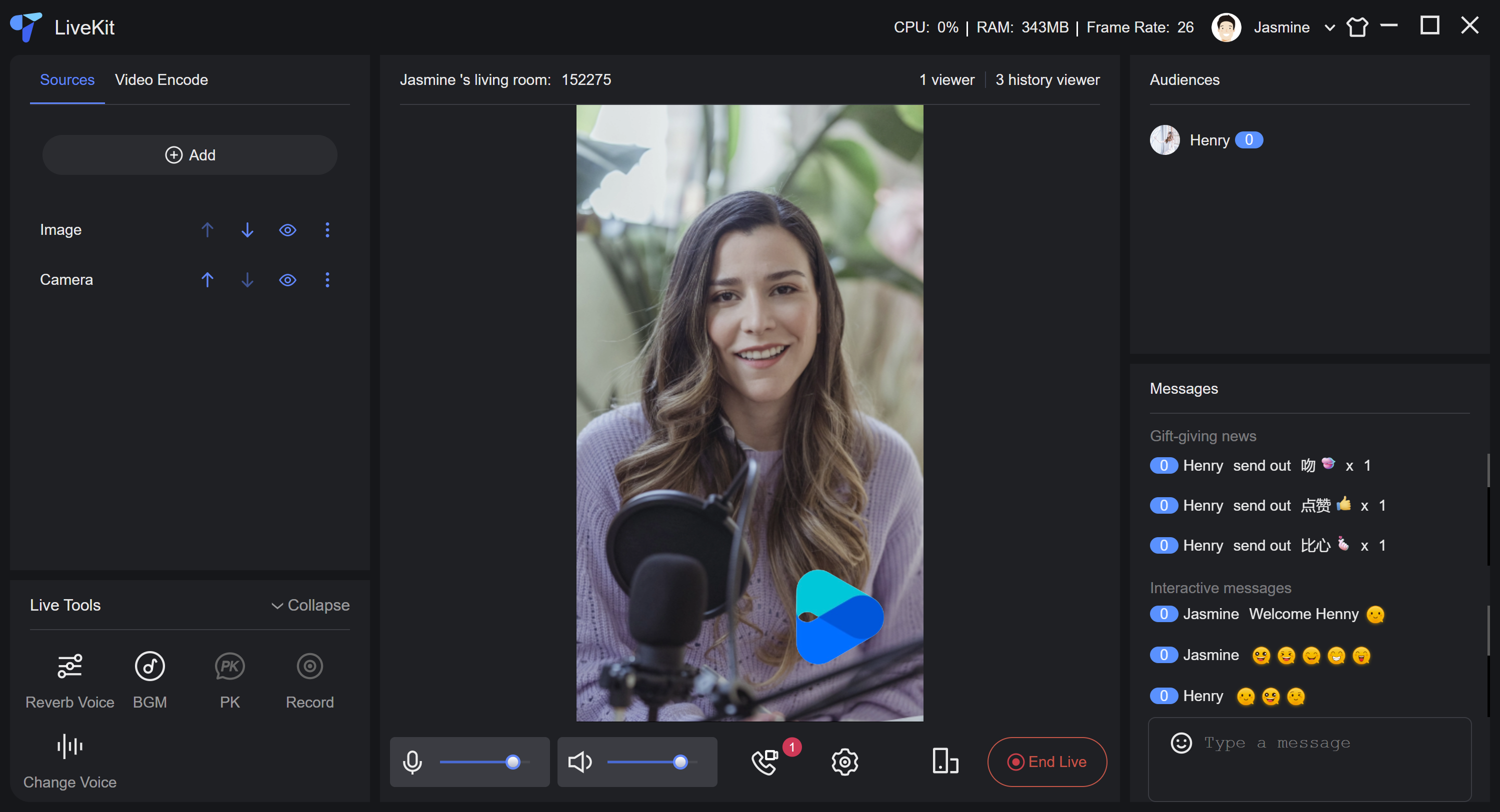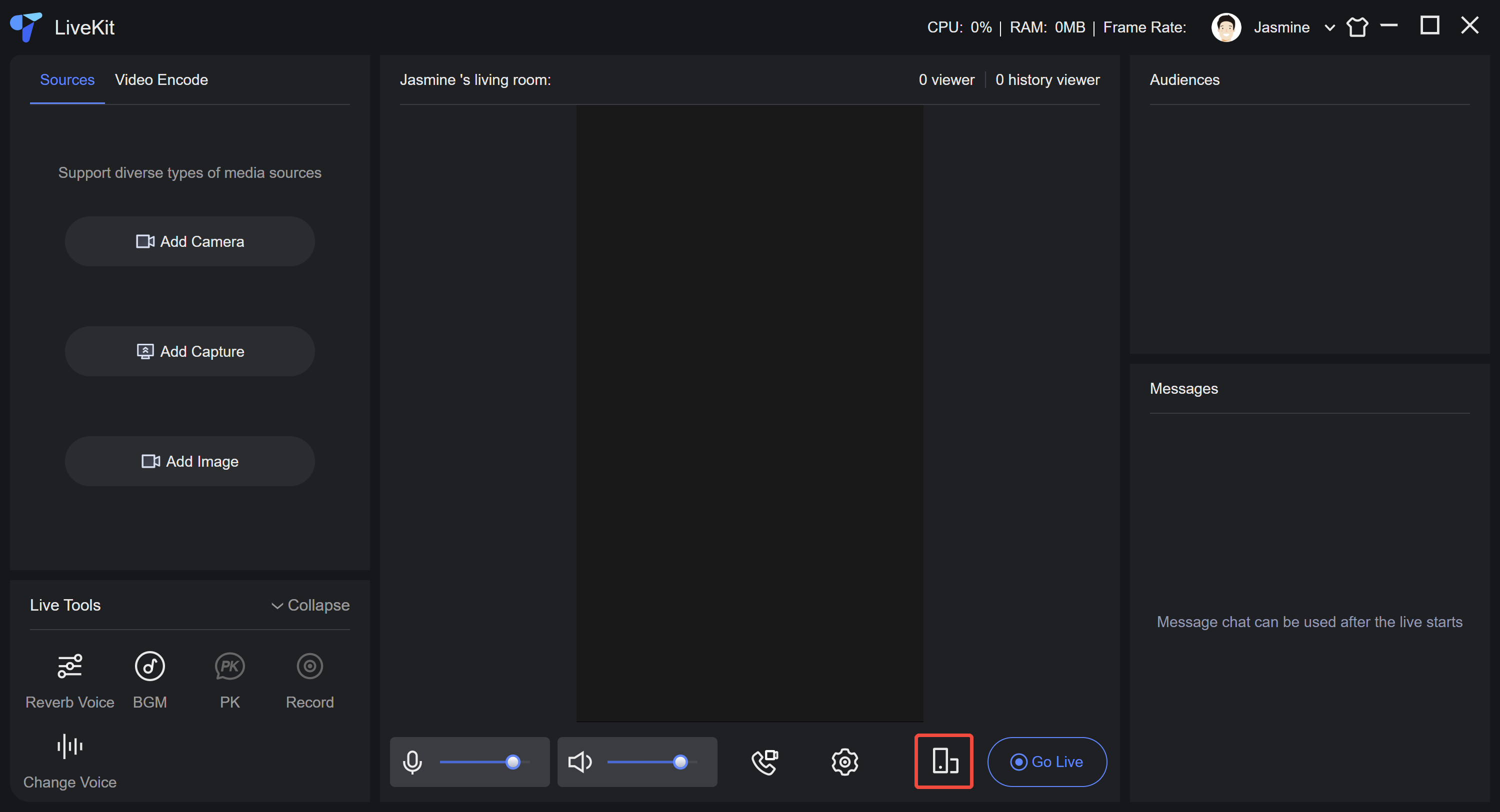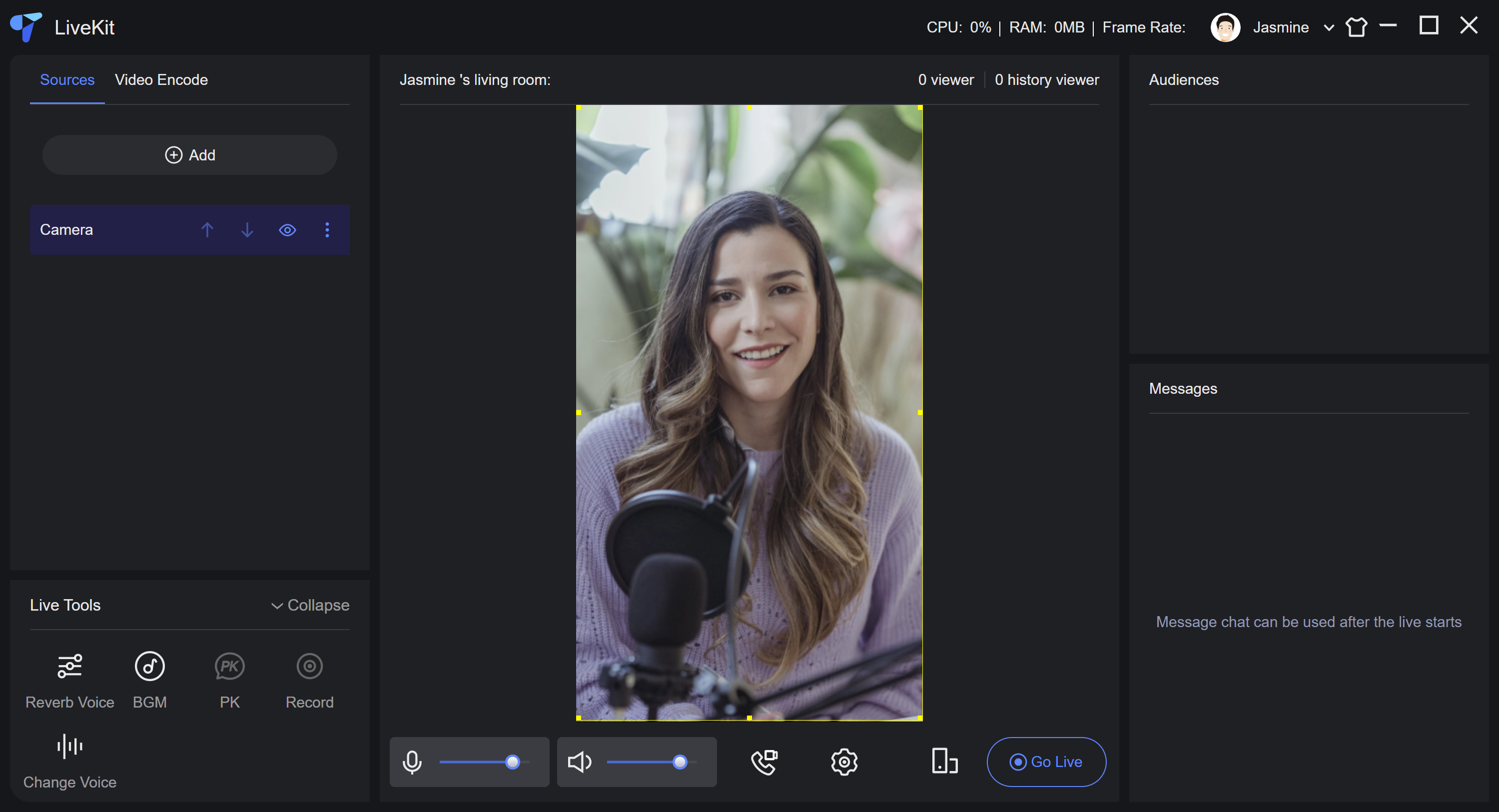 방송을 시작하기 전에 화면 소스를 먼저 추가해야 합니다. 현재 지원되는 항목은 카메라, 화면 공유, 창 공유 및 이미지입니다. 아래 그림은 카메라를 추가한 후의 효과입니다.