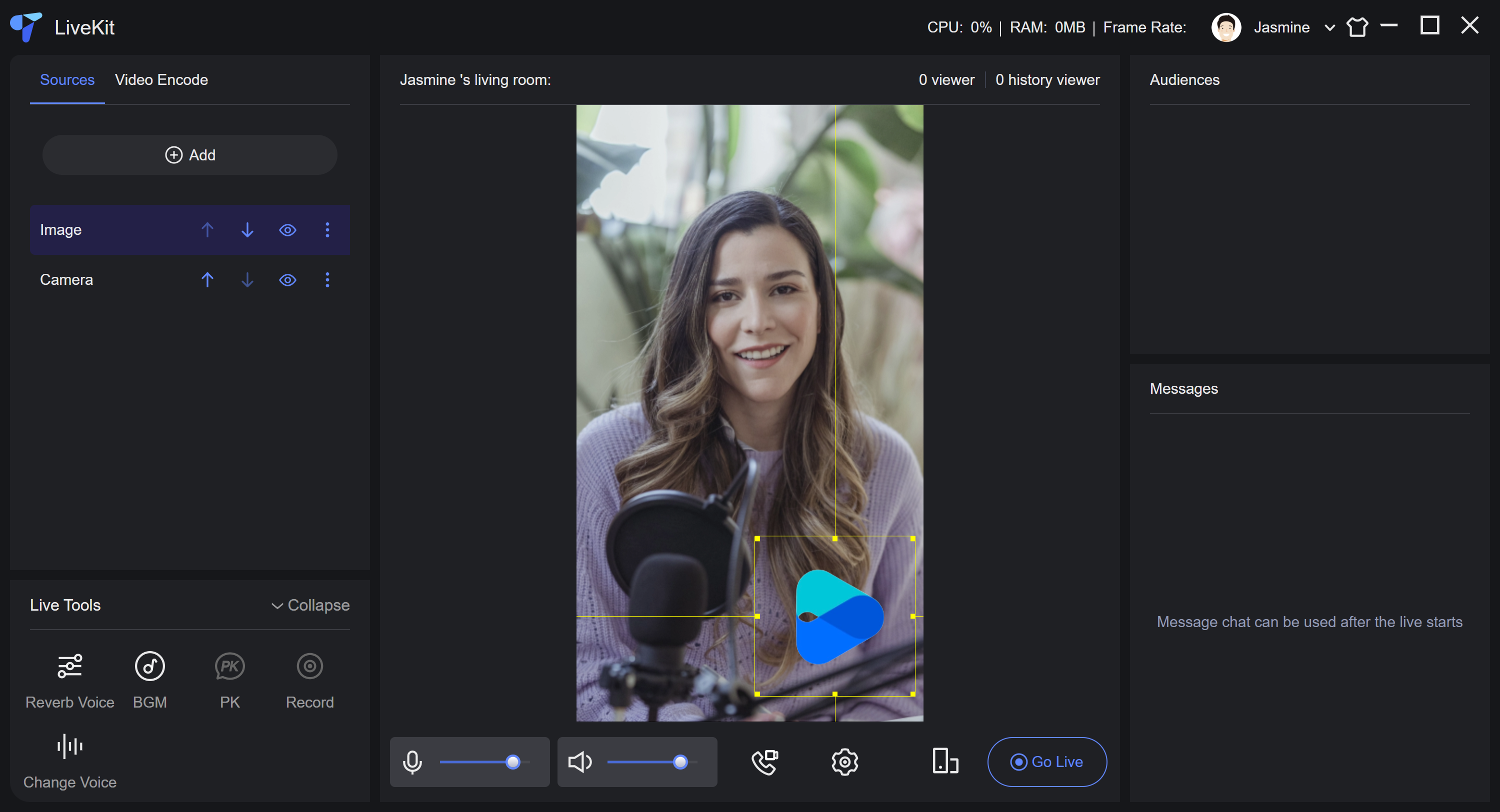 방송 중에 브랜드 Logo를 추가해야 하는 경우, Logo 이미지를 추가할 수 있습니다. 아래 그림은 투명한 배경의 Logo 이미지를 추가한 후의 효과입니다. 새로 추가된 이미지 주위에 노란색 테두리가 표시되며, 이는 현재 선택된 상태임을 나타냅니다. 선택된 상태의 멀티미디어 소스는 마우스를 사용하여 위치를 이동하거나 크기를 조절할 수 있으며, 오른쪽 버튼 메뉴를 사용하여 멀티미디어 소스를 회전시키거나 표시 계층을 변경하는 등의 작업을 할 수 있습니다.