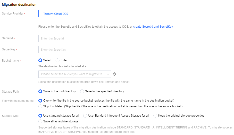 SecretId, SecretKey: Input the Tencent Cloud sub-user SecretId and SecretKey for migration.