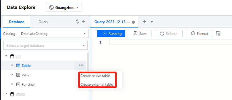 1. Log in to the DLC console and select the service region. Ensure the logged-in user has the permission to create data tables. 2. Navigate to the Data Exploration module. In the left list, click an existing database. Let the mouse pointer over the table row and click the icon. Then click Create Native Table or Create External Table. Note: