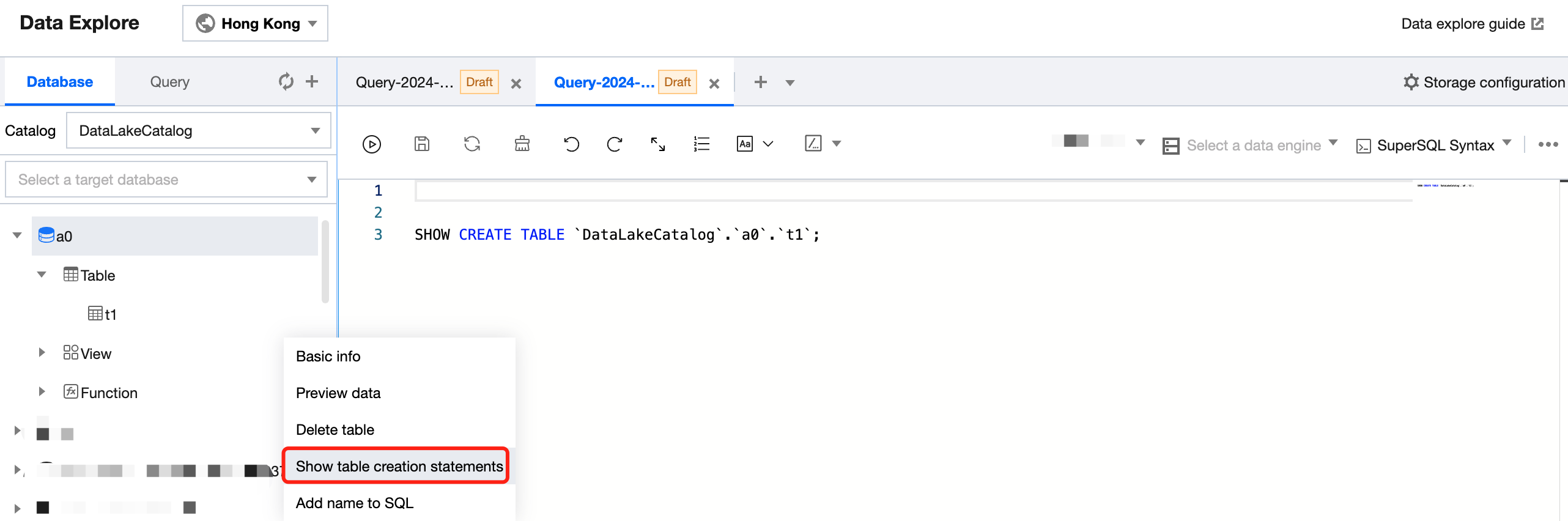 In the data table project, let the mouse pointer hover over the Data Table Name row, then click the icon. From the pull-down menu, click Delete Table. DLC will automatically generate an SQL statement to delete the data table. Execute the SQL statement to delete the data table. When an external table is deleted, only the metadata stored in DLC is deleted. The data source files are not affected.