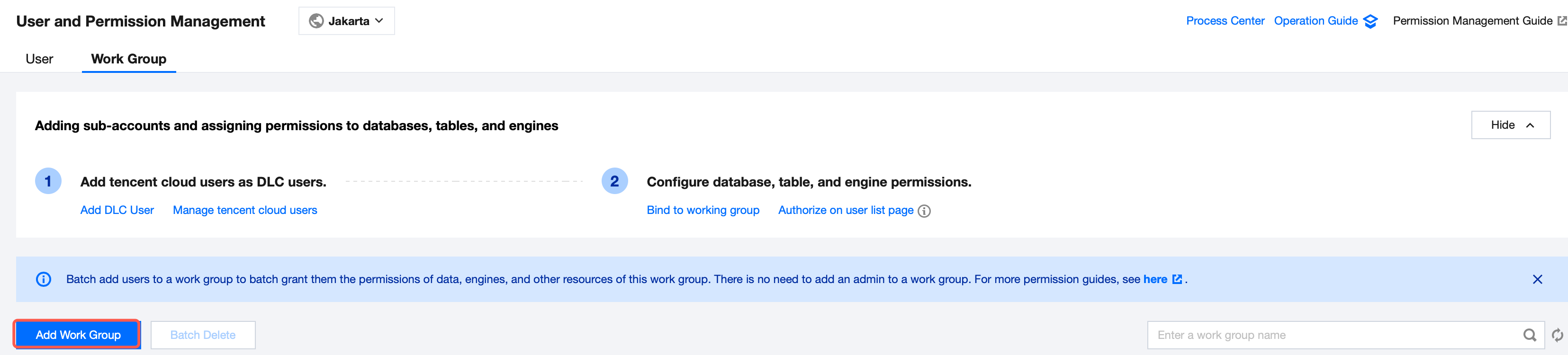 1. Log in to the DLC console and select the service region. Ensure the logged-in user has the permission to create data tables. 2. Go to Data Management through the menu on the left, enter Database, and click the name of the database where the data table will be located to enter the database management center page.