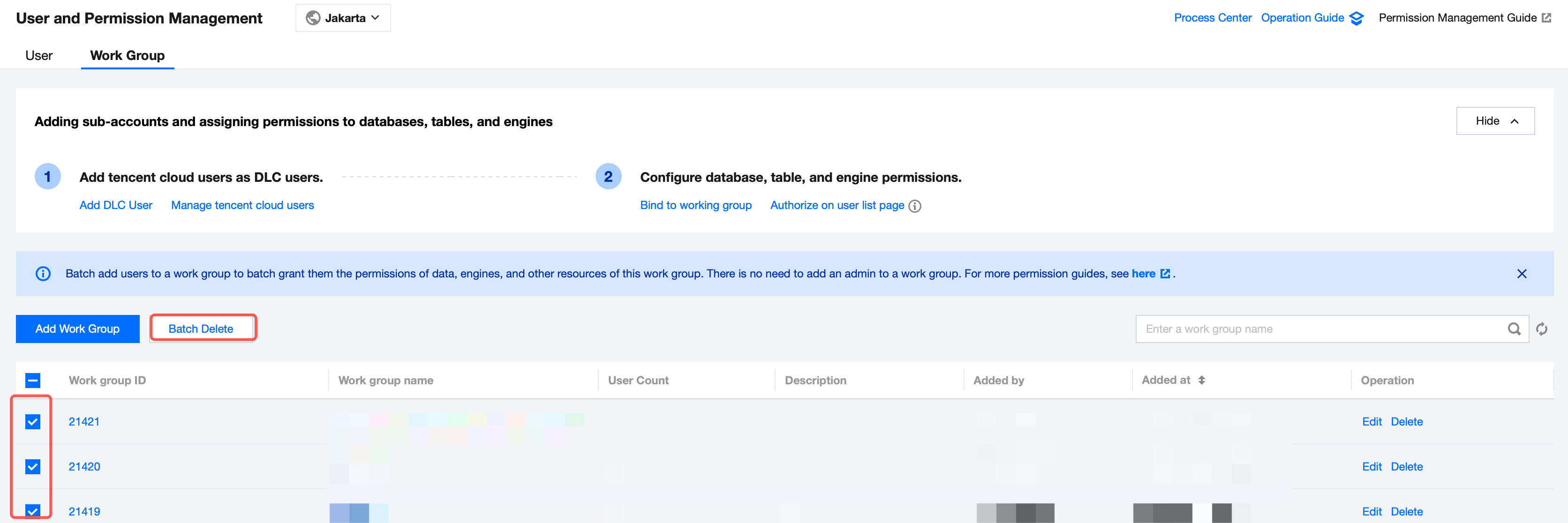 1. Log in to the DLC console and select the service region. Ensure the logged-in user has the permission to delete the data table. 2. Go to Metadata Management > Database via the left sidebar., and click the database name where the data table is located to enter the database management center page. 3. Click the Delete button on the right of the data table that you want to delete. After a second confirmation, the corresponding data table will be deleted, and the data in the data table will be cleared.