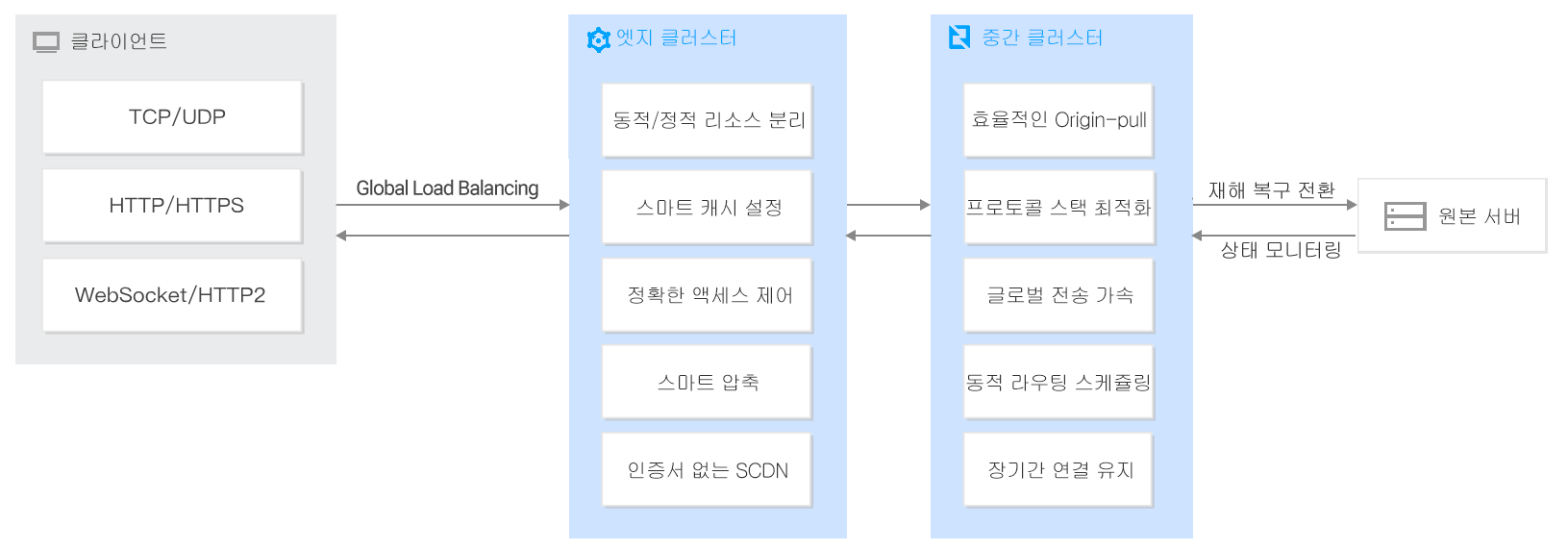 Tencent Cloud 전역 가속(Enterprise Content Delivery Network)은 동적, 정적 혼합형 원스톱 가속 서비스를 제공하고 레이어 4 및 레이어 7 프로토콜로 모두 액세스 가능합니다. 엣지 캐시, 로드 밸런서, 스마트 링크, 효율적인 Origin-pull 등 모든 기능 면에서 맞춤형 설정을 지원하므로 다양한 비즈니스 수요를 충족할 수 있습니다. 한편, 재해 복구 전환, 보안 보호 등 고급 설정을 통해 네트워크 안정 및 가용성을 보장함으로써 안심하고 가속 서비스를 이용할 수 있습니다.