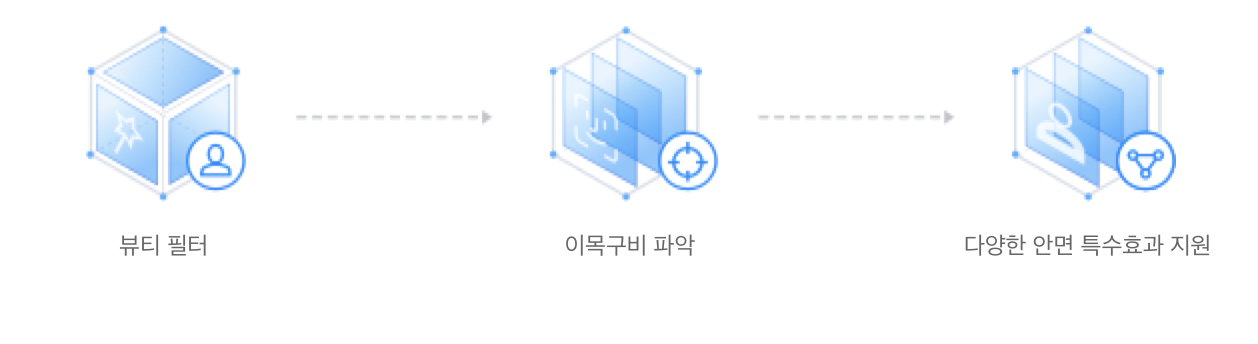 얼굴의 눈, 코, 입, 귀 등 이목구비를 정확하게 파악하는 기술로 뷰티 필터 및 메이크업, 얼굴형 편집, 애니메이션 효과, 얼굴 바꾸기, 스티커 등의 기능을 사용할 수 있습니다.
