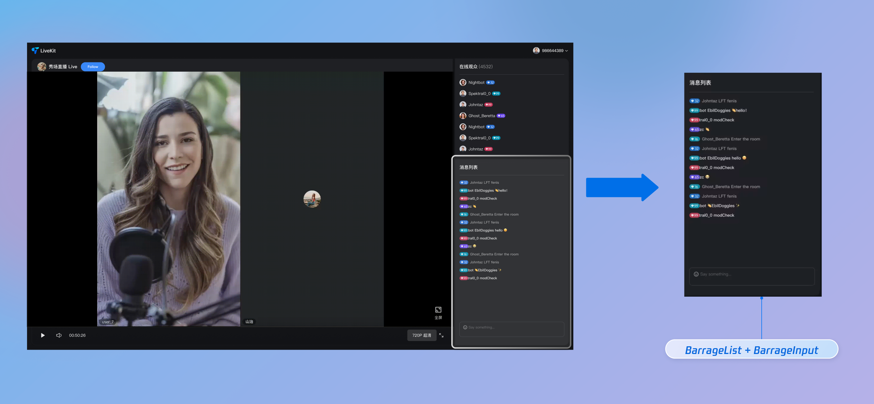 BarrageState delivers a complete live comments solution for your live streaming app. Main features include:BarrageState instance linked to your current live room's liveId, and watch the messageList to receive the latest list of live comment messages.import { useBarrageState } from 'tuikit-atomicx-vue3';import { watch } from 'vue'const { messageList } = useBarrageState()// Watch for real-time updates to messageList and update your UI accordinglywatch(messageList, (newVal, oldVal) => {console.log(newVal)});