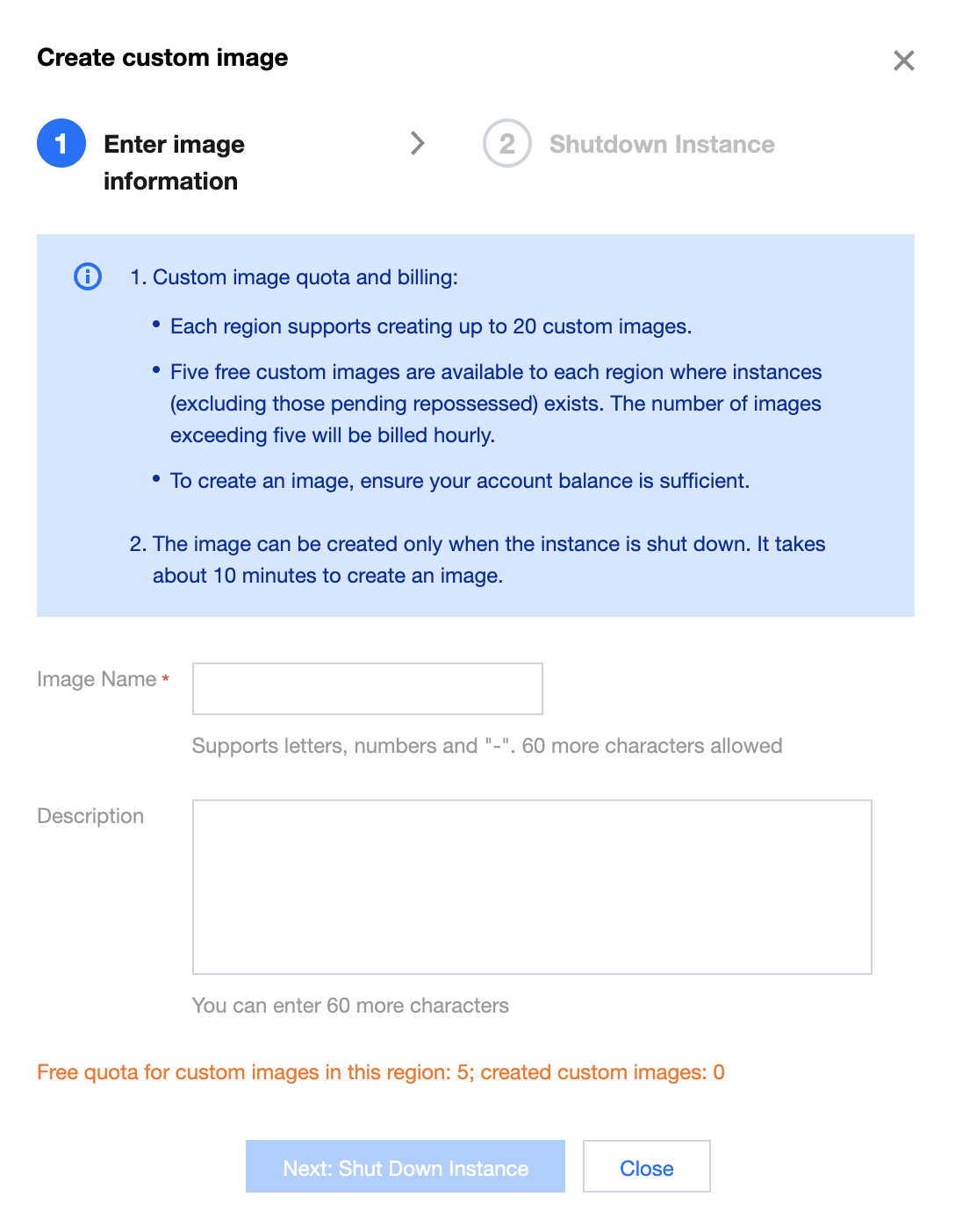 4. In the Enter image information step in the Create custom image pop-up window, enter the Image name and Description, and click Next: Shut down the instance.