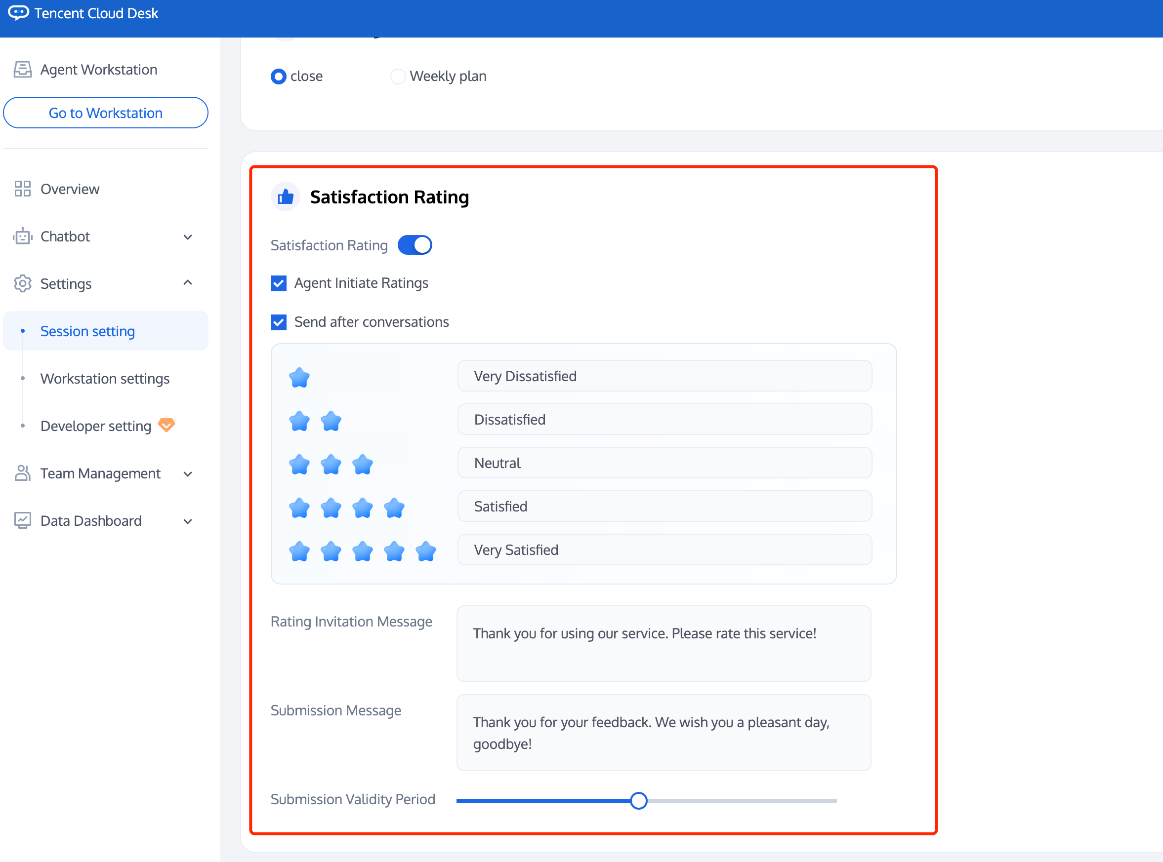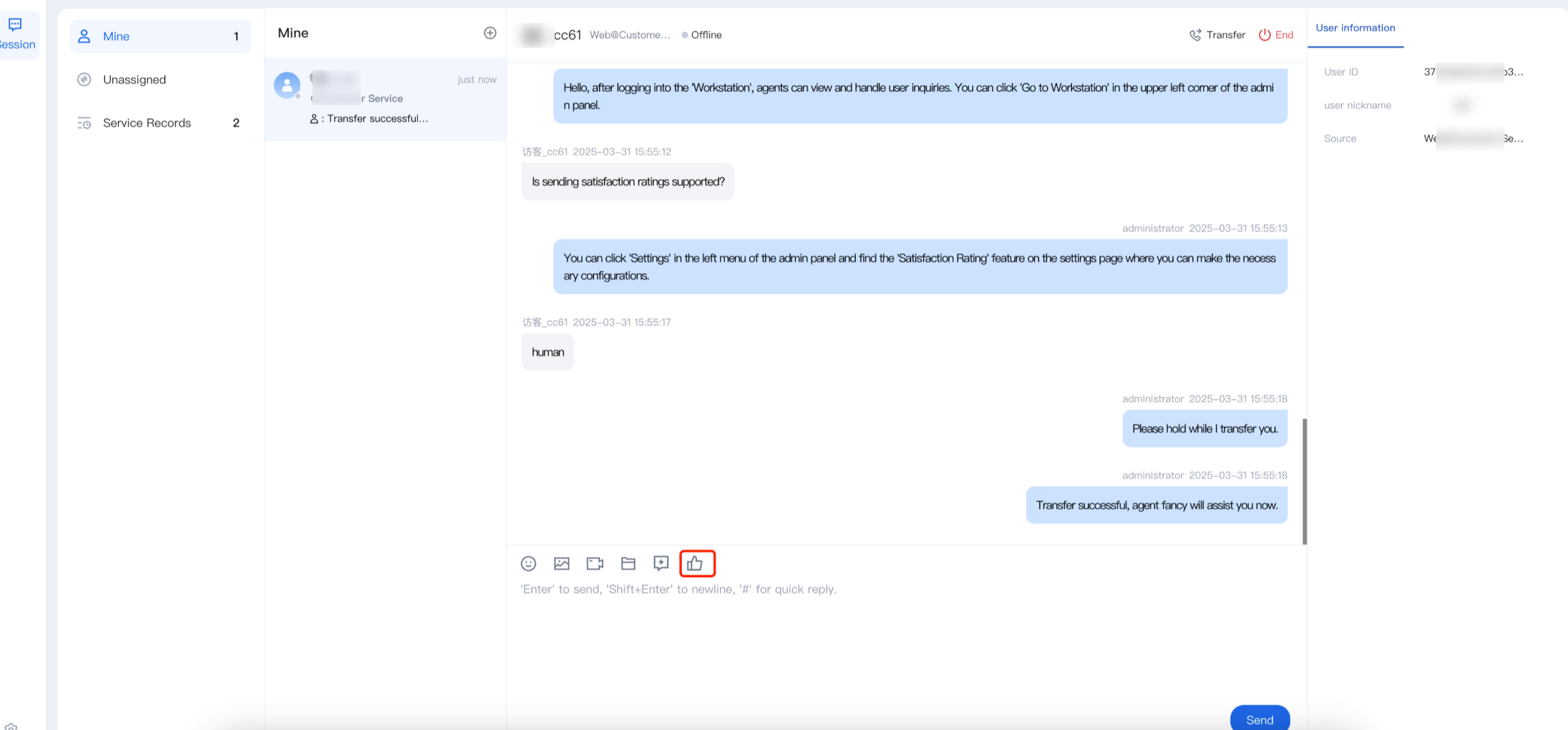 Staff can click the User Satisfaction button in the conversation window to send an invitation to the user.