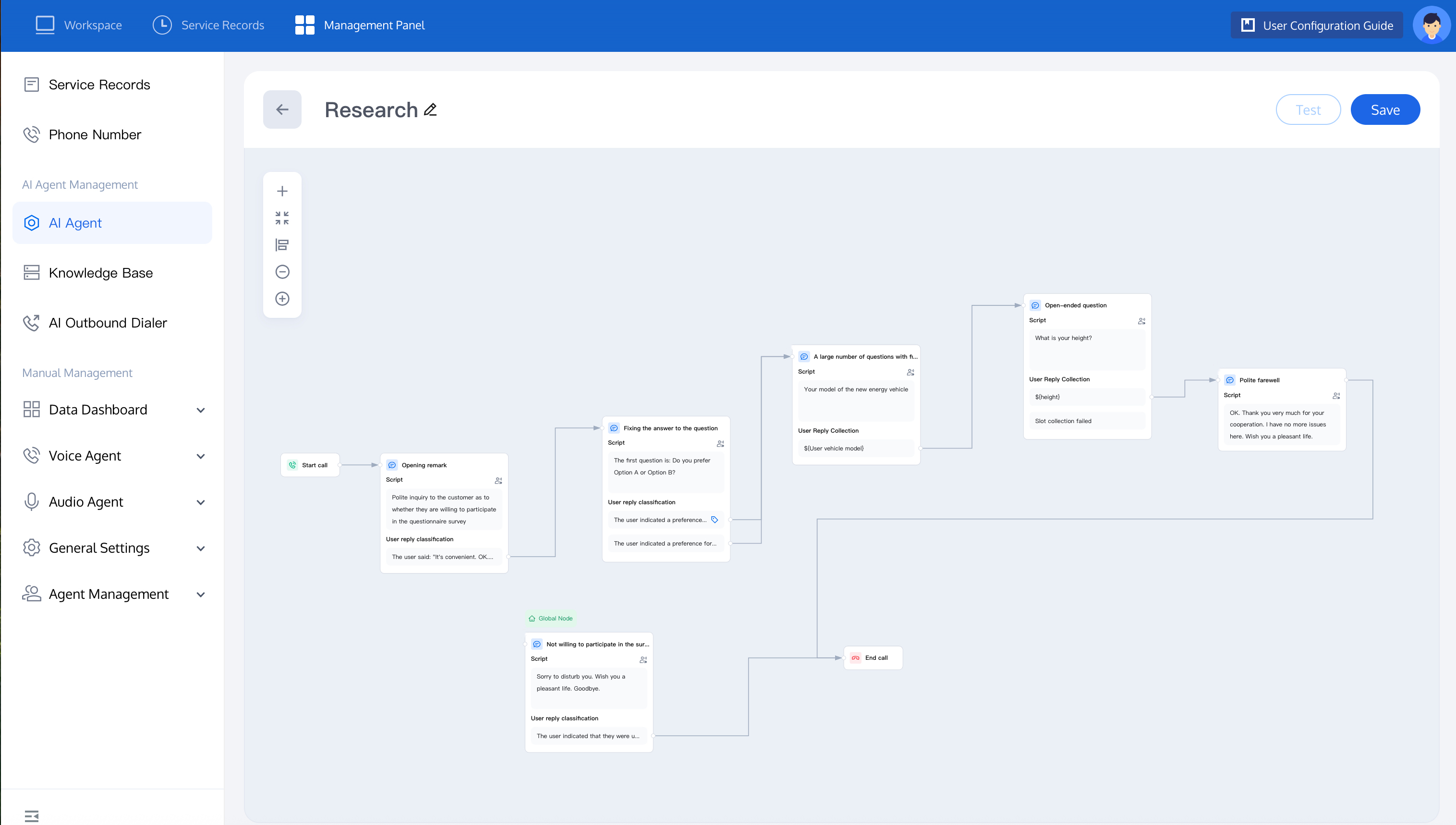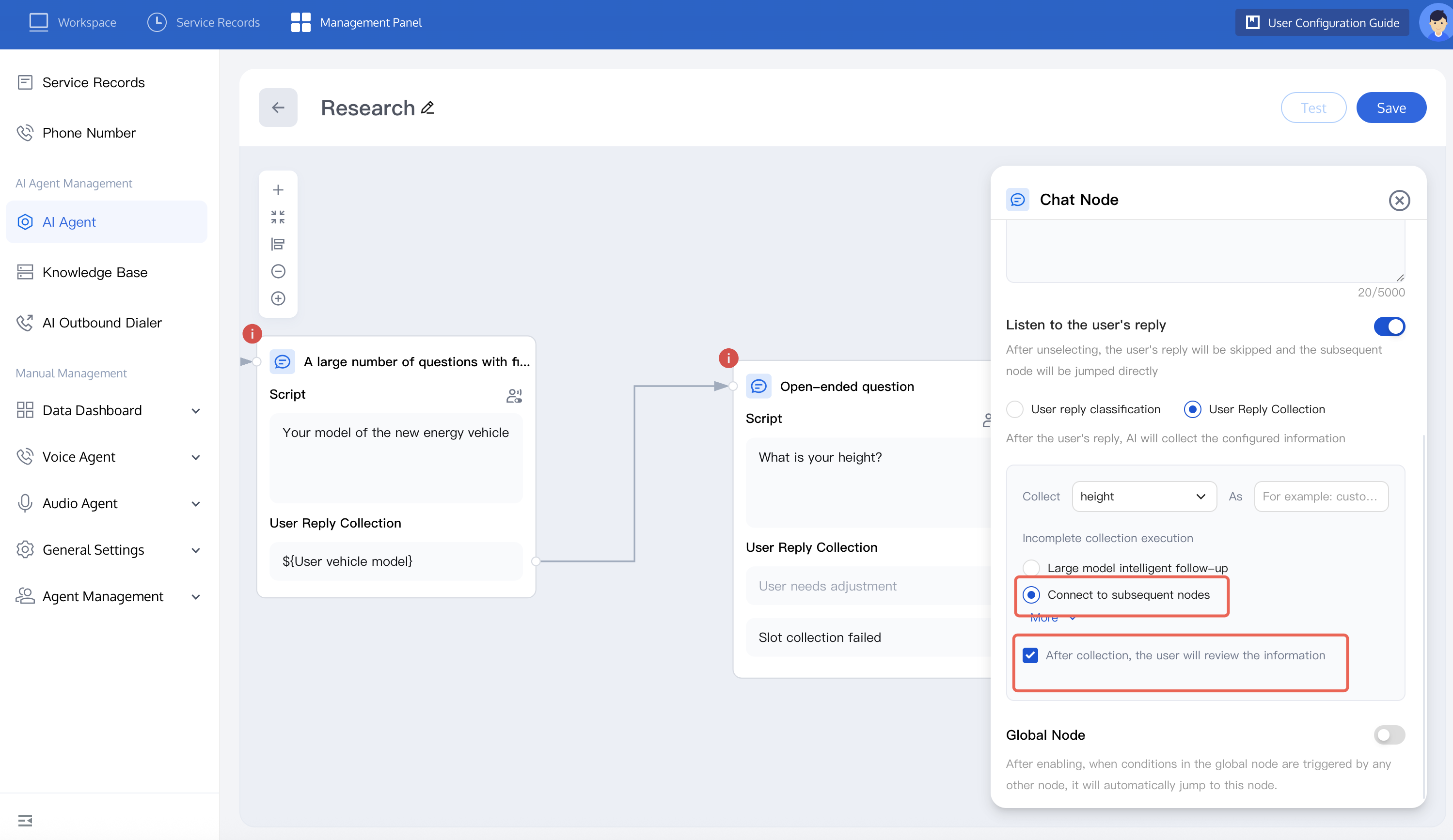 5. To learn more about node function, see node introduction. Once completed, you can test the dialogue effect of the Intelligent Agent. For detailed operations, refer to test dialogue effect.