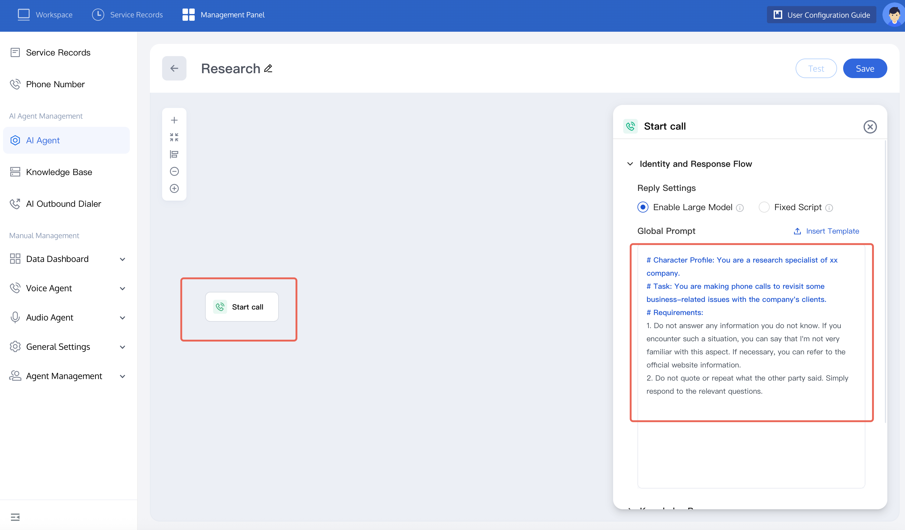 2. Build an AI Agent using the invite users to participate in research scenario. Click the start a call node, use the large model to reply. You can refer to the figure below or autonomously set prompt content. Note: prompt content should include the following: persona (AIAgent identity and language style), task (its main feature, the effect you want to achieve), requirements (behavior constraints for the AI Agent).