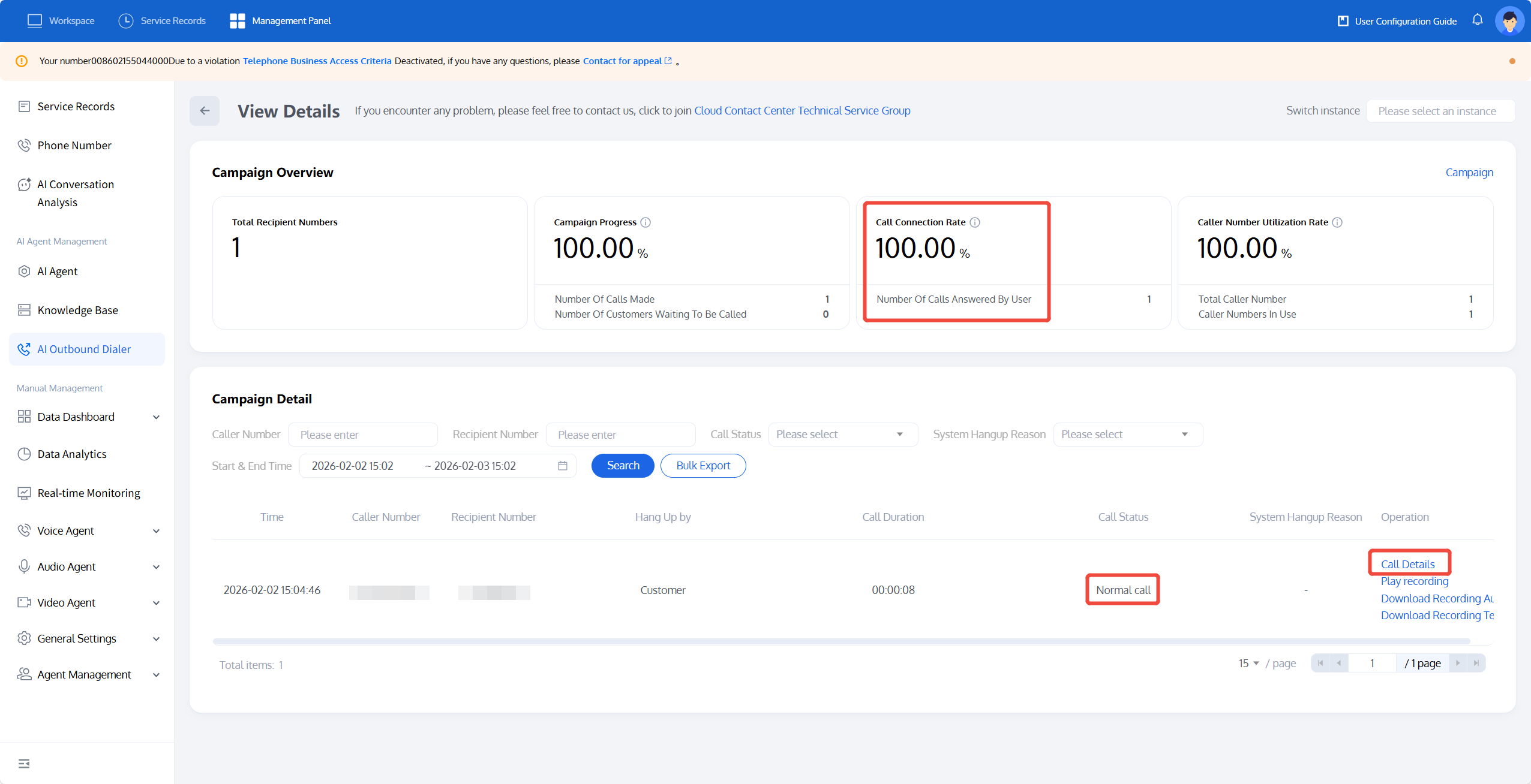 You can see the connection rate of this outbound call task and the call status of each call, and locate the reason for unanswered calls.