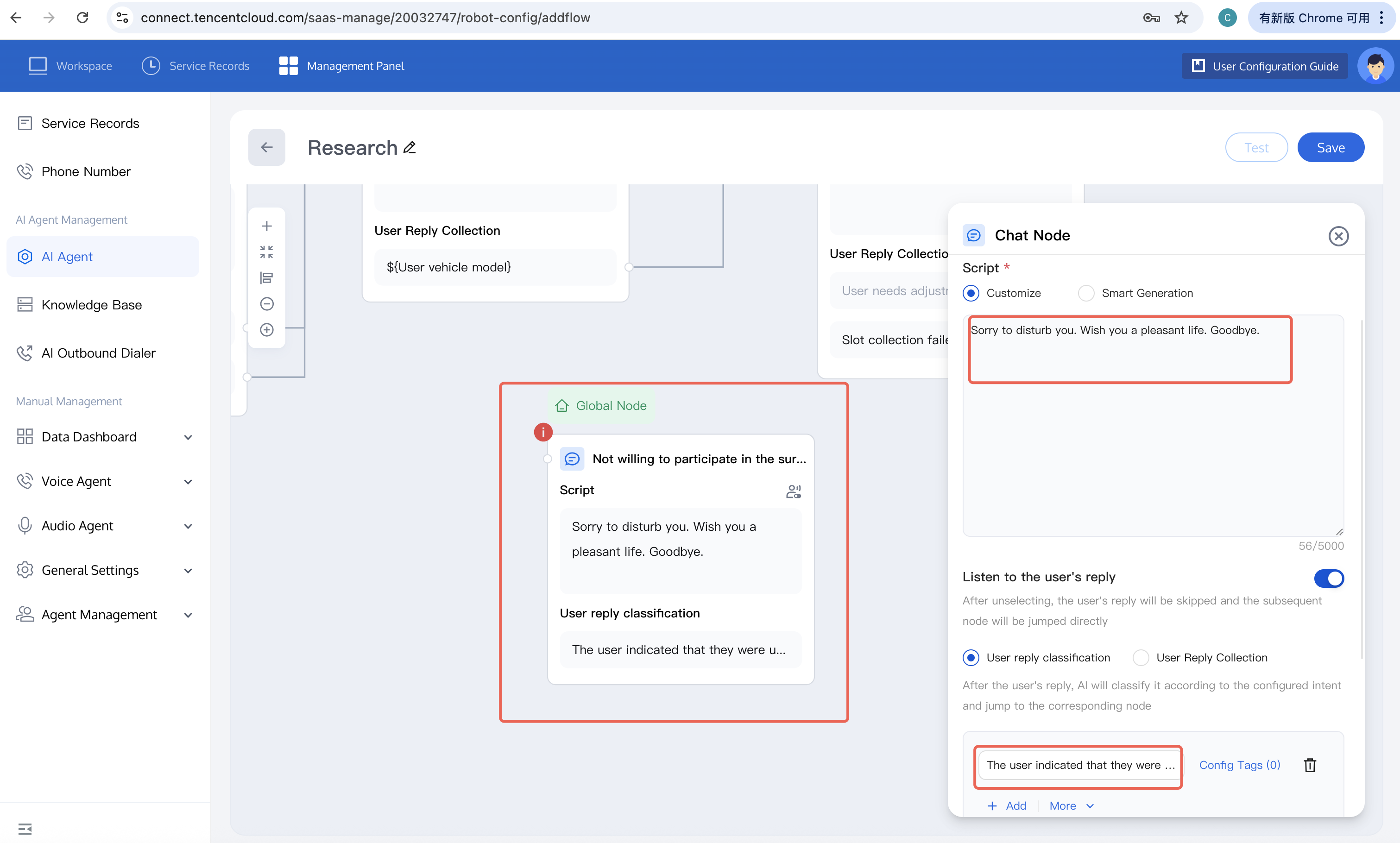 4. During the dialogue, the user may refuse to continue participating in the survey at any time. You can refer to the figure below to set the global node and end the dialogue. Once enabled, when any other node triggers the conditions in the global node, automatic redirection to this node is allowed.