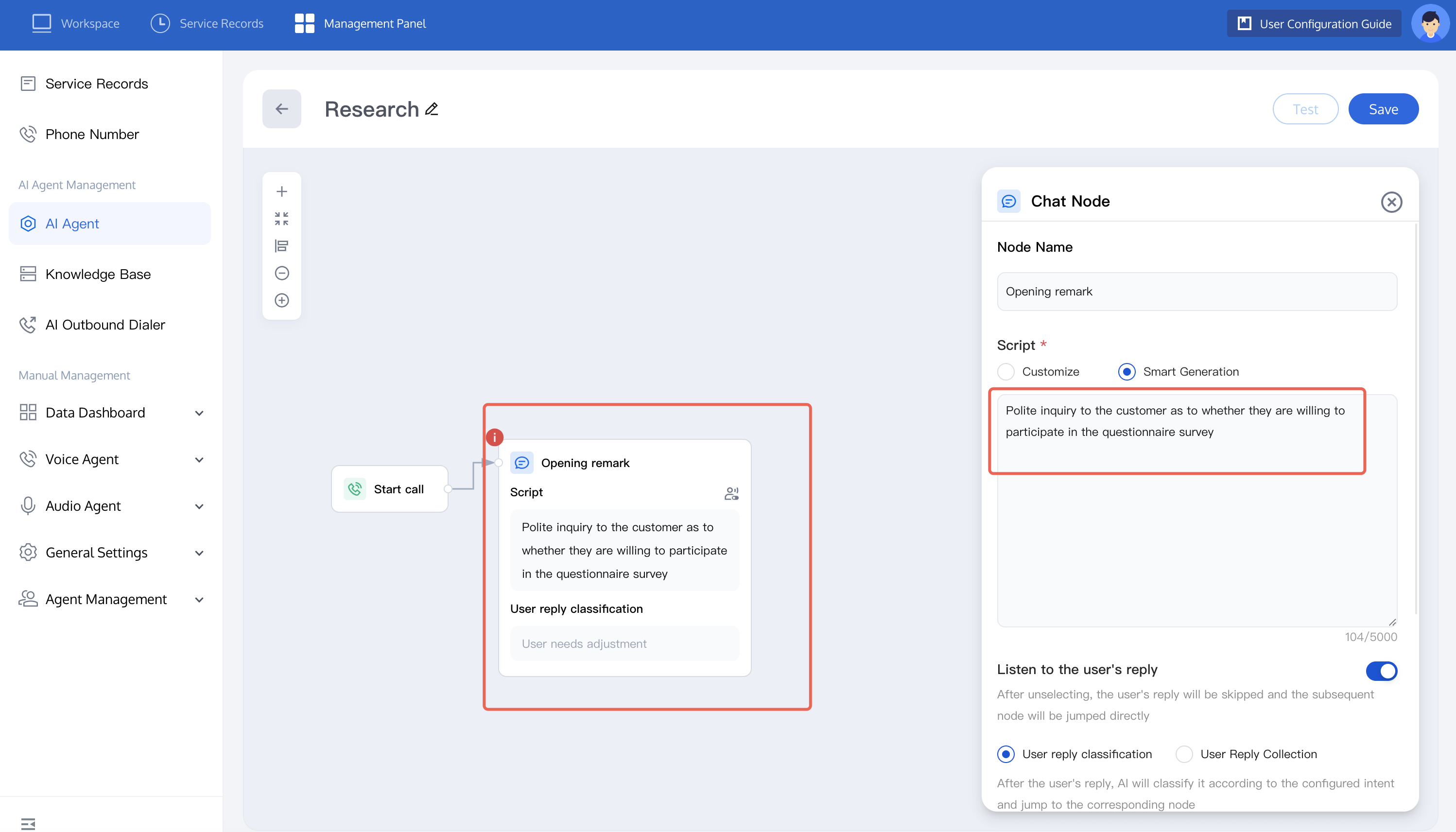 Add a new Conversation Node as the opening remark. Select AI generation to let the large model generate personalized scripts. Refer to the figure below, set the user reply category for easy participation. For each category, list possible user replies such as: yes, okay. This helps the large model better understand the intent.