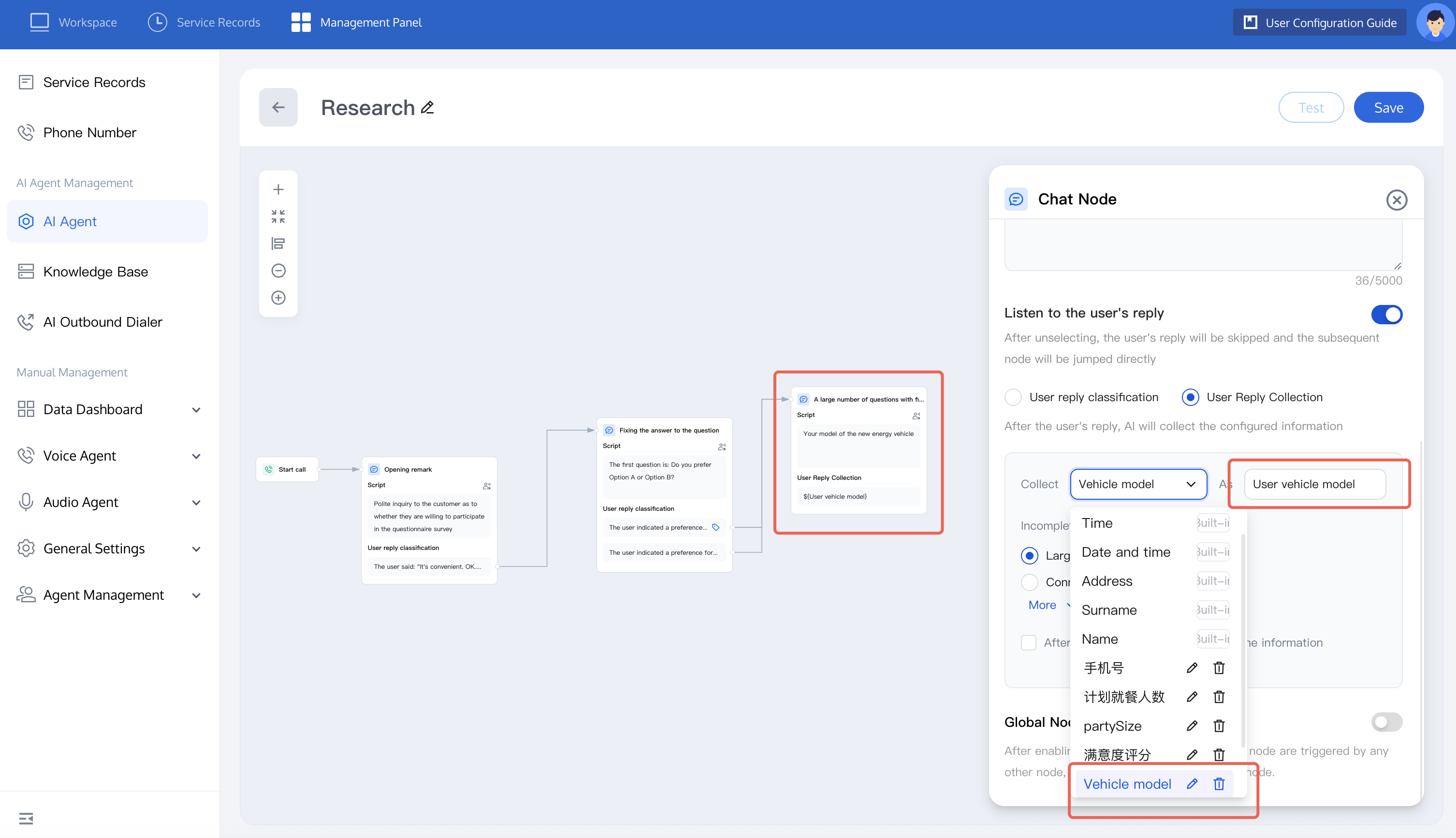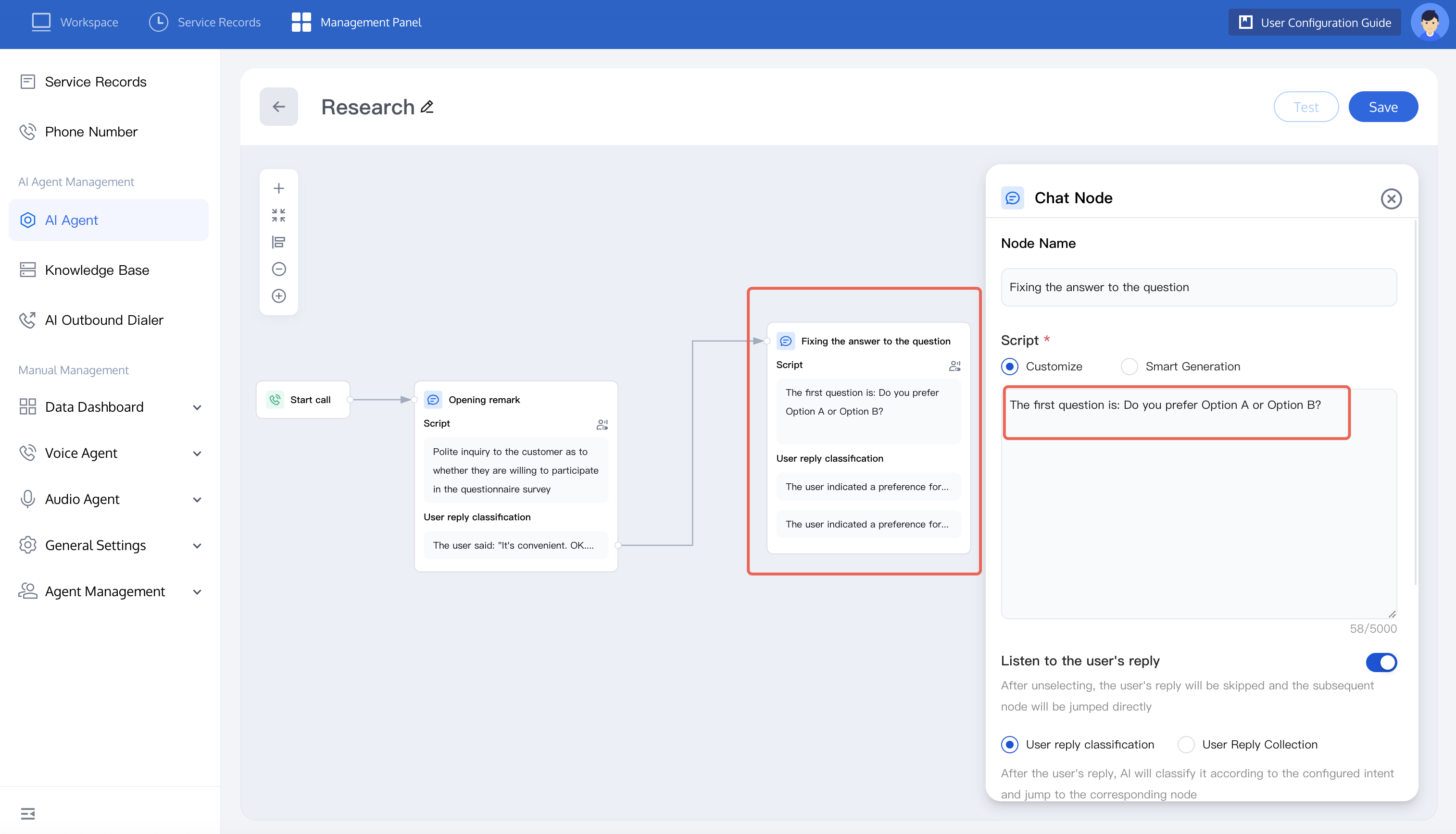 3. Set the research question ask node. According to the user answer type, research questions can be three types: