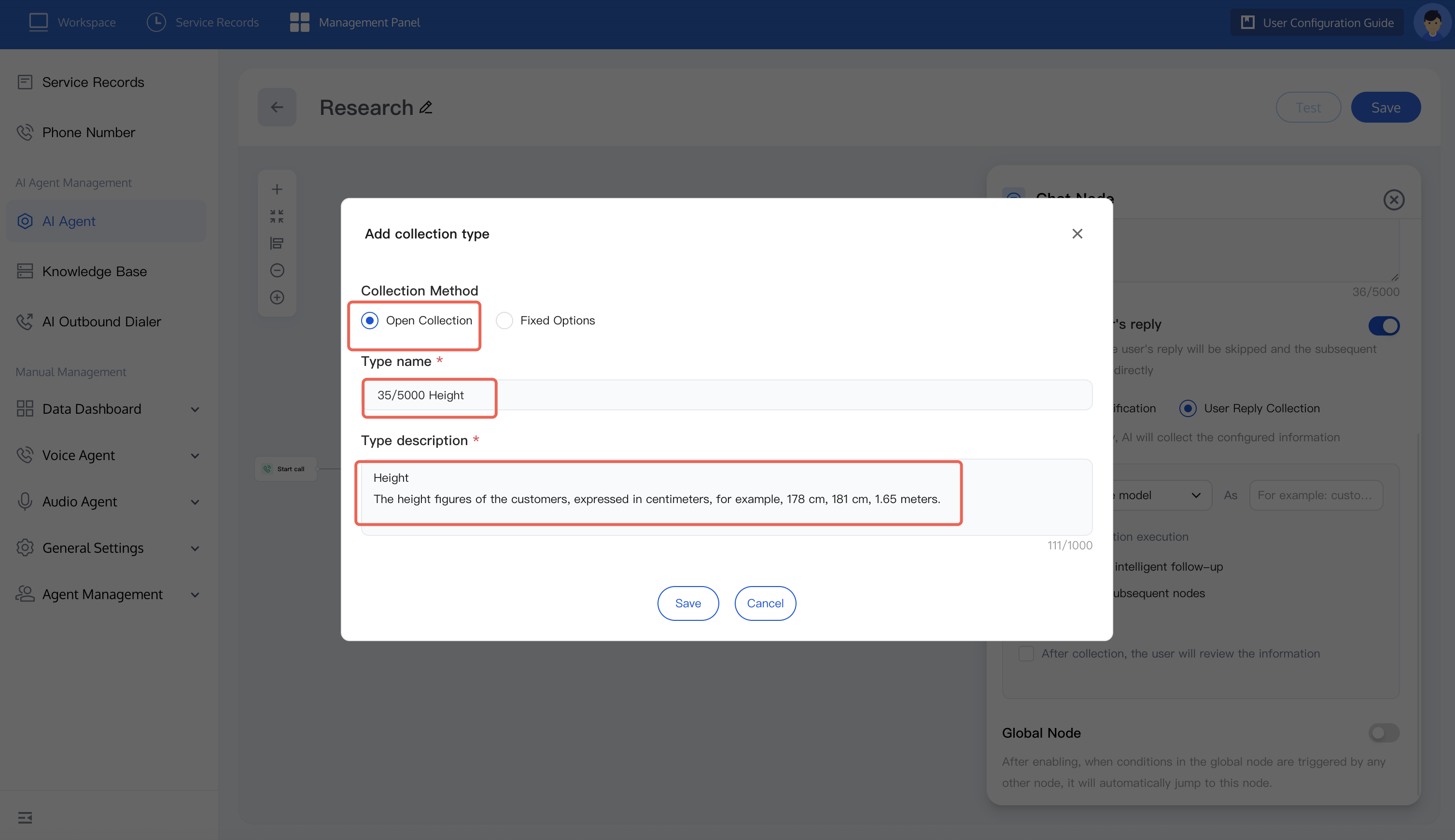 If the answer to the research question is open, such as height, weight, you can use user reply collection to configure the content you want to collect. In this setting, the system will automatically collect user responses to open questions and tag them.