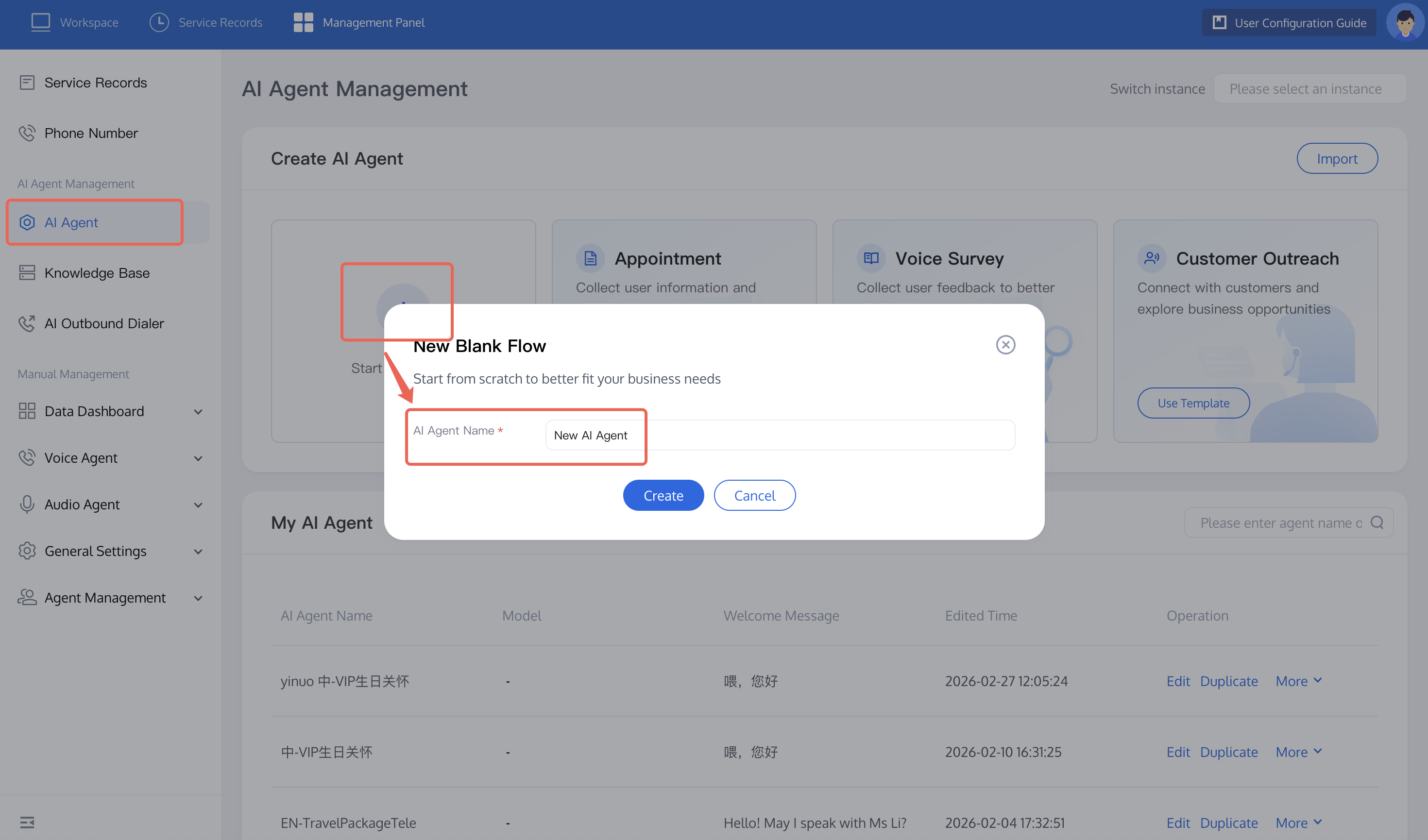 This document aims to help you quickly start with AI Voice Agent and implement its application in outbound scenarios, providing process guidance from preliminary preparation to speech data analysis. You can learn about product features through Introducing AI Voice Agent. This document includes the following content: preparation, Intelligent Agent setup for research scenarios, outbound call task creation, and speech data analysis.