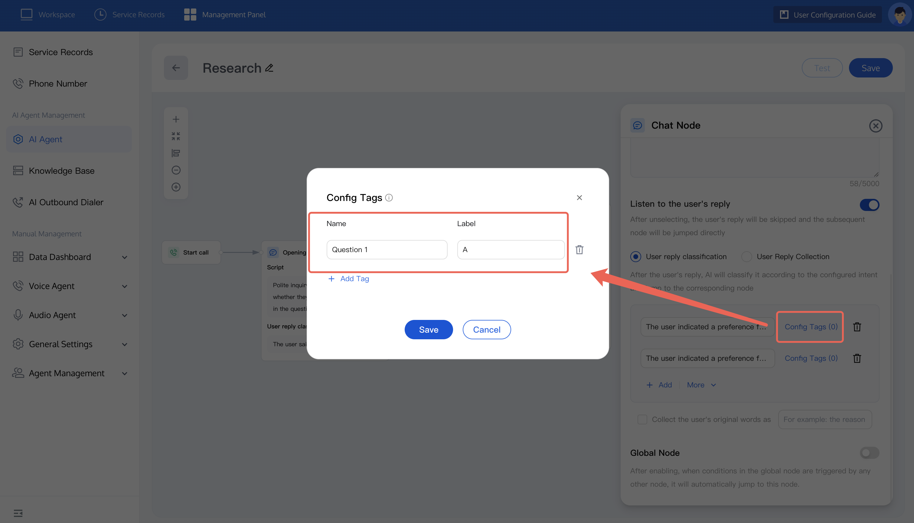 If you wish to trace user responses to each question, you can use the Tag Configuration feature (you can view tags in the Post-Call Analysis feature). For example, if a user selects option A for question 1, you can set the tag: question 1-option A. The specific configuration is as shown below: