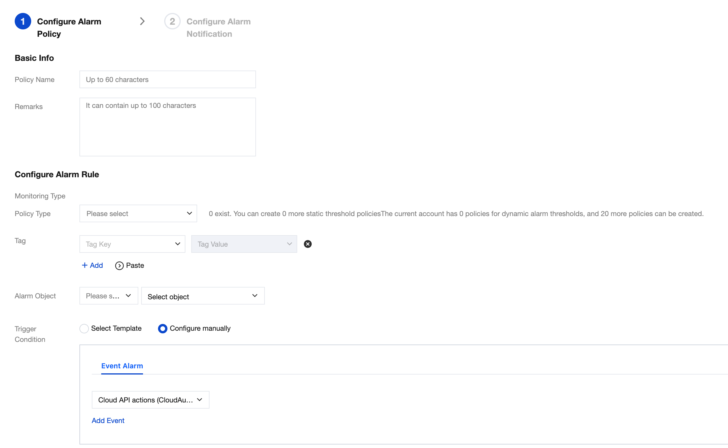 You can use the alarm policy of Tencent Cloud Observability Platform (TCOP) to set threshold alarms for GooseFSx monitoring metrics. Tencent Cloud Observability Platform is a service that provides real-time monitoring and alarms for cloud product resources. Users can set alarm rules, view alert history, and receive alarm notifications for GooseFSx monitoring metrics through TCOP. For more information about Tencent Cloud Observability Platform, please see Create Alarm Policy. Operation Steps