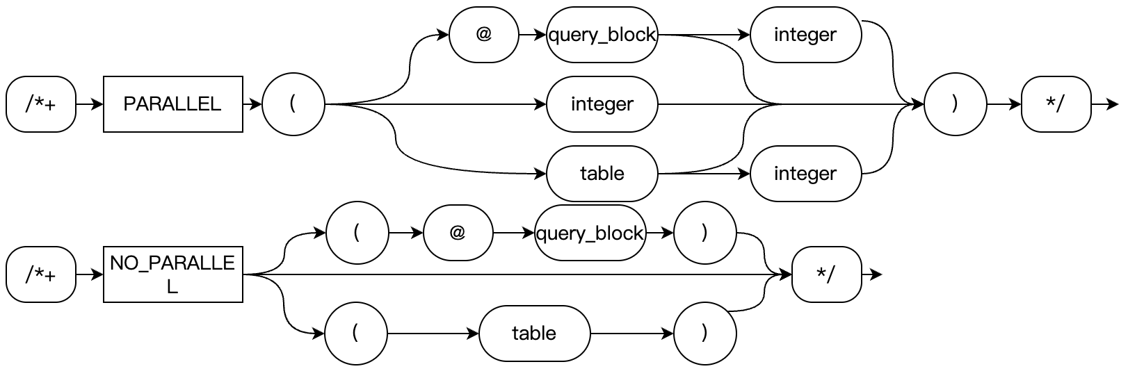 PARALLEL(num) -- Global level, the level of the Query BlockPARALLEL(@qbname num) -- the level of the Query BlockPARALLEL(tablename) -- the level of the TablePARALLEL(tablename num) -- the level of the TableNO_PARALLEL -- Global level, the level of the Query BlockNO_PARALLEL(@qbname) -- the level of the Query BlockNO_PARALLEL(tablename) -- Table level