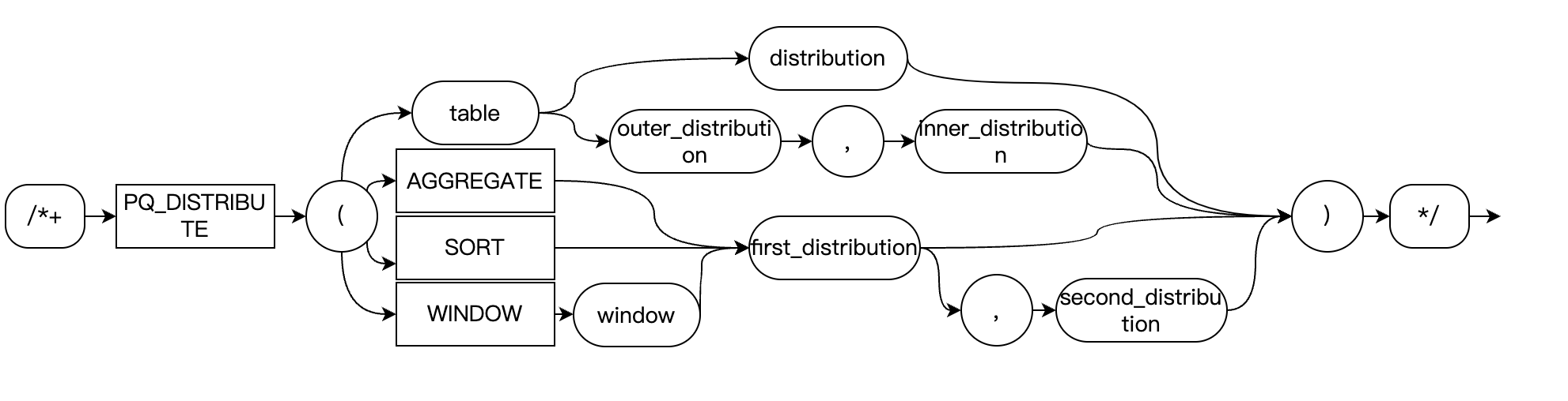 -- Basic syntaxPQ_DISTRIBUTE(tablespec strategy1 strategy2)PQ_DISTRIBUTE(tablespec strategy)-- For specific operation typesPQ_DISTRIBUTE(target strategy1 strategy2)