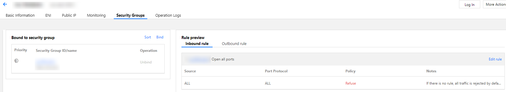 1. Faça login no console do CVM e clique no ID/nome da instância para acessar a sua página de detalhes. 2. Clique na guia Security Group (Grupo de segurança) para exibir os grupos de segurança vinculados e suas regras de saída e entrada. Confirme se as portas relacionadas aos processos da Web estão abertas, conforme mostrado abaixo: