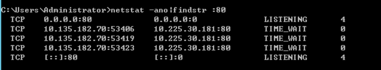 Para uma instância do Windows: abra a ferramenta de linha de comando CMD para executar o comando netstat -ano|findstr :80, conforme mostrado abaixo: