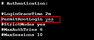 6. Pressione i para alternar para o modo de edição. Localize #Authentication e altere o valor de PermitRootLogin para yes, conforme mostrado na figura a seguir: