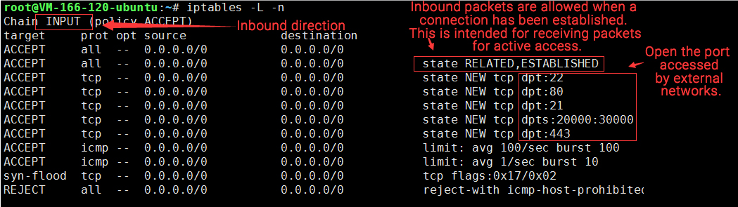 Para definir o firewall, execute iptables -nvL para exibir as regras.