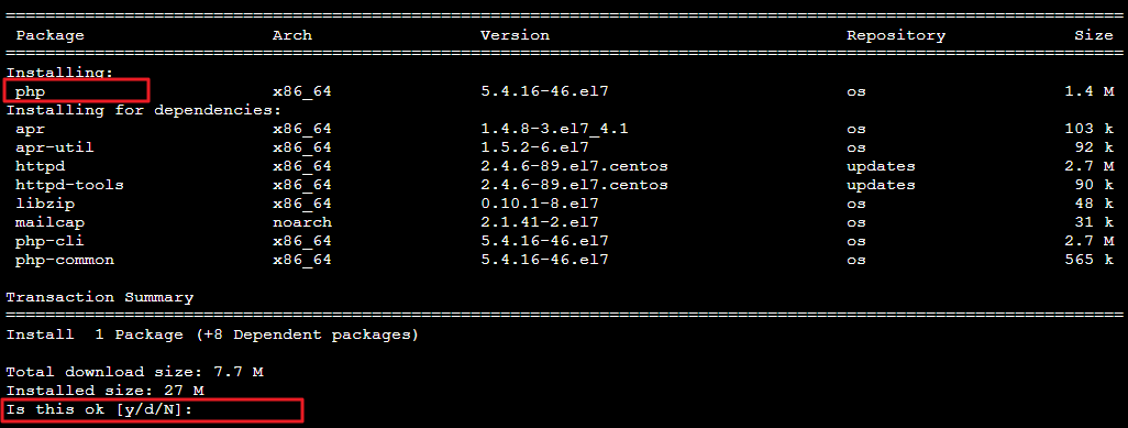Por exemplo, depois de executar o comando yum install PHP para instalar o PHP, o seguinte prompt será exibido: