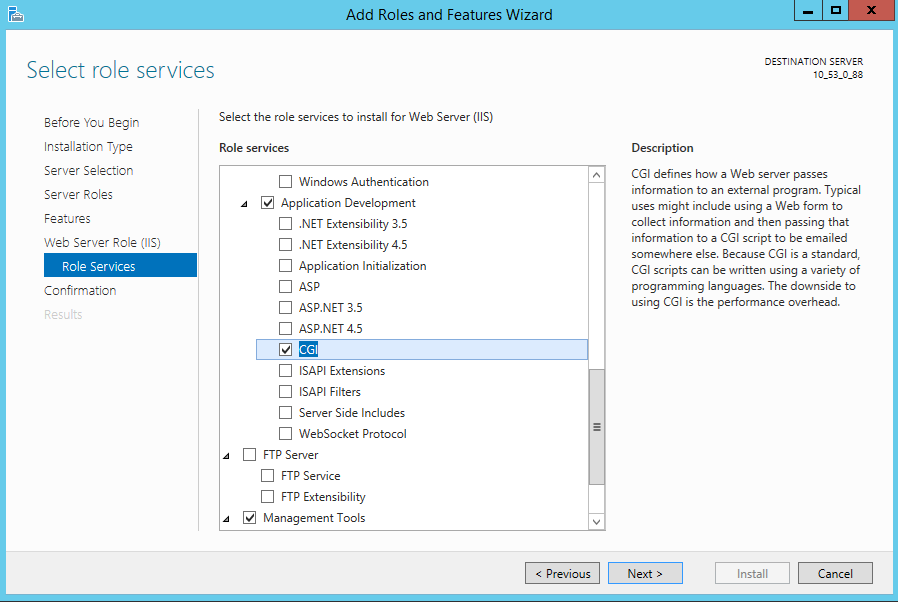 6. Na página Role Services (Serviços de função), marque CGI e clique em Next (Avançar), conforme mostrado abaixo:
