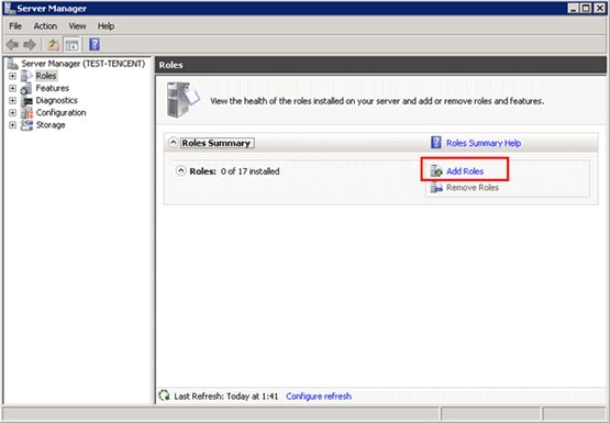 3. Selecione Roles (Funções) na barra lateral esquerda e clique em Add Roles (Adicionar funções) no painel direito, conforme mostrado abaixo: