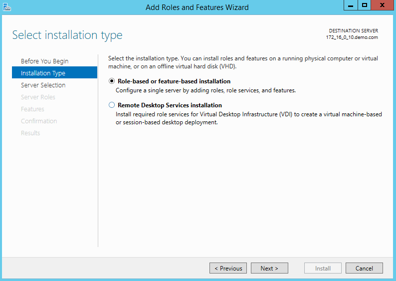 5. Selecione Role-based or feature-based installation (Instalação baseada em função ou recurso) e clique em Next (Avançar) duas vezes, conforme mostrado abaixo: