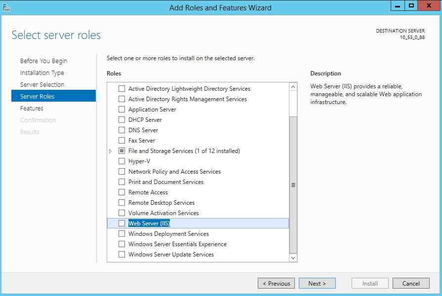 6. Marque Web Server (IIS) (Servidor Web (IIS)) na página "Select server roles (Selecionar funções de servidores)", conforme mostrado abaixo: