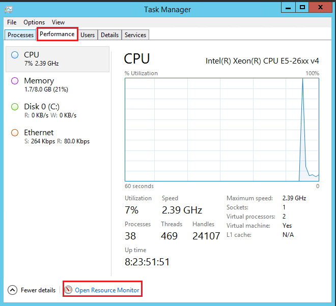 1. No CVM, clique em . Selecione o Task Manager (Gerenciador de tarefas) para abrir a janela dele. 2. Selecione a página da guia Performance (Desempenho) e clique em Open Resource Monitor (Abrir monitor de recursos). Verifique a figura abaixo para mais detalhes.