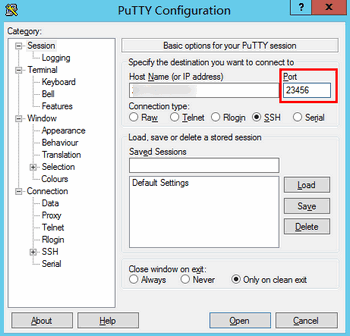 2. Na janela "PuTTY Configuration (Configuração do PuTTY)", insira o endereço IP público do CVM do Linux, defina Port (Porta) como o número da nova porta e clique em Open (Abrir), conforme mostrado na figura a seguir.