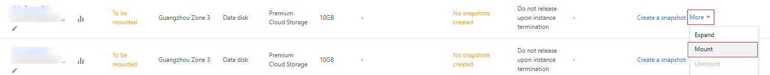 3. Localize a instância com o sistema reinstalado e clique em More (Mais) > Mount (Montar) à direita, conforme mostrado abaixo: