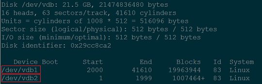 Suponha que o disco de dados montado no CVM do Linux antes da reinstalação tenha duas partições, vdb1 e vdb2, conforme mostrado abaixo: