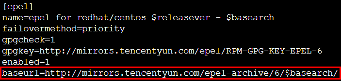 Nesse exemplo, altere baseurl=http://mirrors.tencentyun.com/epel/$releasever/$basearch/ para baseurl=http://mirrors.tencentyun.com/epel-archive/6/$basearch/. O resultado deve ser o seguinte: