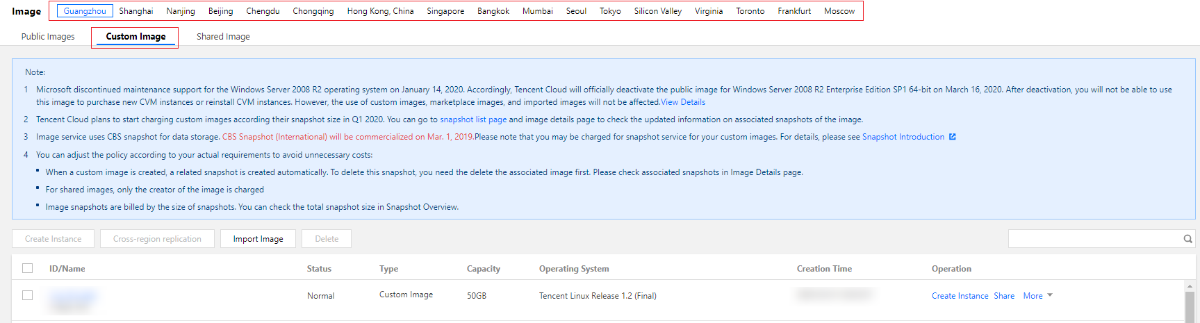 6. Mude para uma região de destino. Selecione a imagem copiada na lista de imagens da região e clique em Create Instance (Criar instância) para criar a mesma instância do CVM.