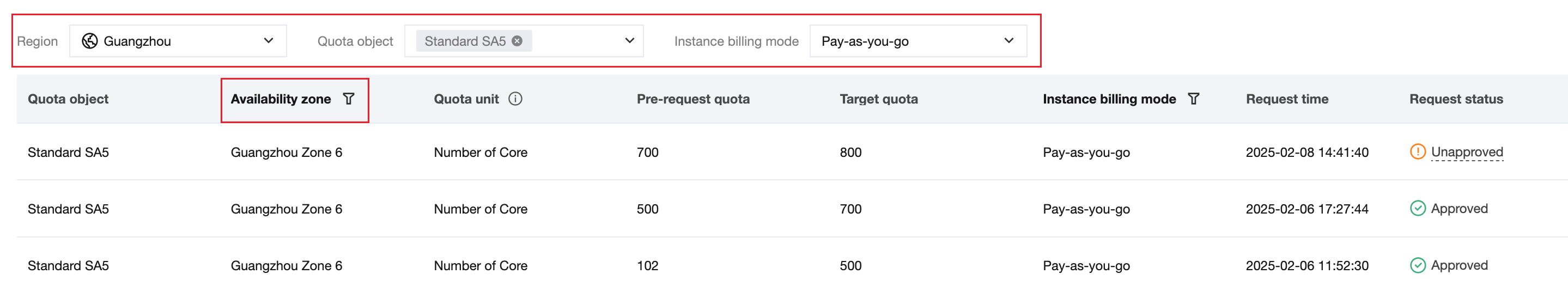 2. Na página de registro de solicitações de cota, você pode filtrar selecionando região, zona de disponibilidade, objeto de cota e modo de cobrança de instância para localizar rapidamente os registros de solicitações de cota e visualizar o progresso e os resultados das solicitações de cota.