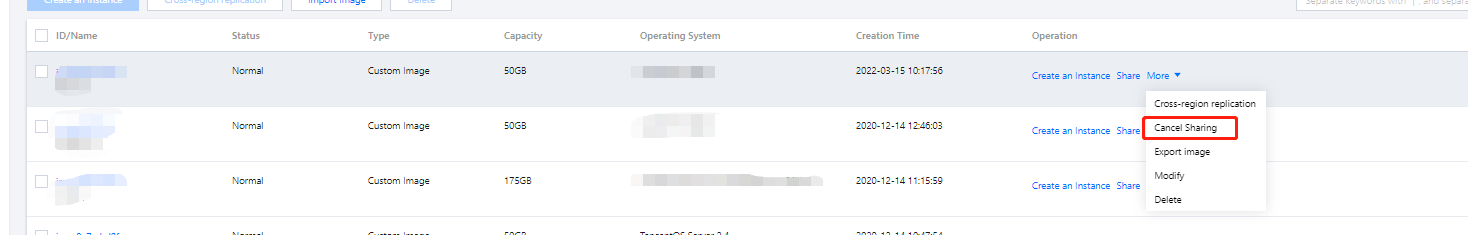 É possível usar a API ModifyImageSharePermission para cancelar o compartilhamento de imagens. Para obter mais informações, consulte ModifyImageSharePermission.