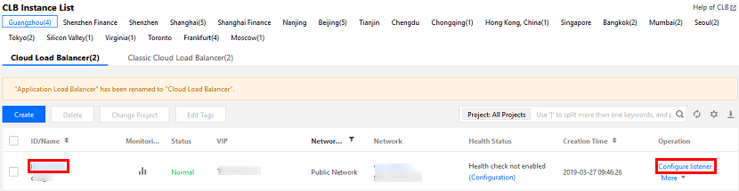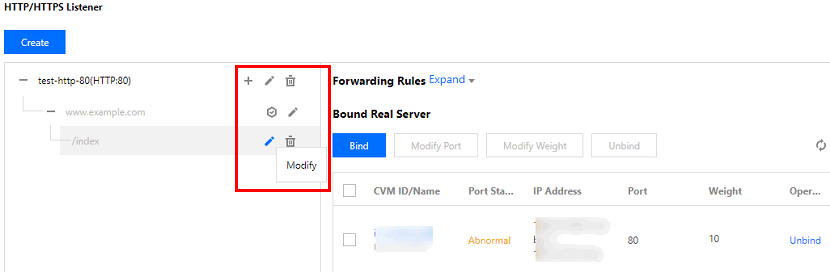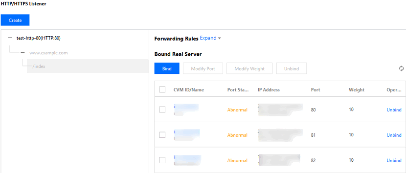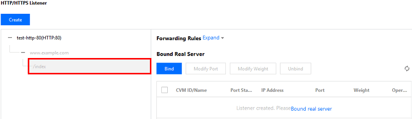 Protocolo e porta de escuta | Protocolo e porta de escuta de um listener: Protocolo de escuta: o CLB aceita vários protocolos, incluindo TCP, UDP, TCP SSL, HTTP e HTTPS. O HTTP é usado neste exemplo. Porta de escuta: uma porta usada para receber solicitações e encaminhá-las para o servidor de back-end. Intervalo de portas: 1 a 65535. Atualmente, estas portas estão reservadas e indisponíveis para os usuários: 843, 1020, 1433, 1434, 3306, 3389, 6006, 20000, 36000, 42222, 48369, 56000 e 65010. As portas de escuta de cada instância do CLB devem ser exclusivas. | HTTP:80 |