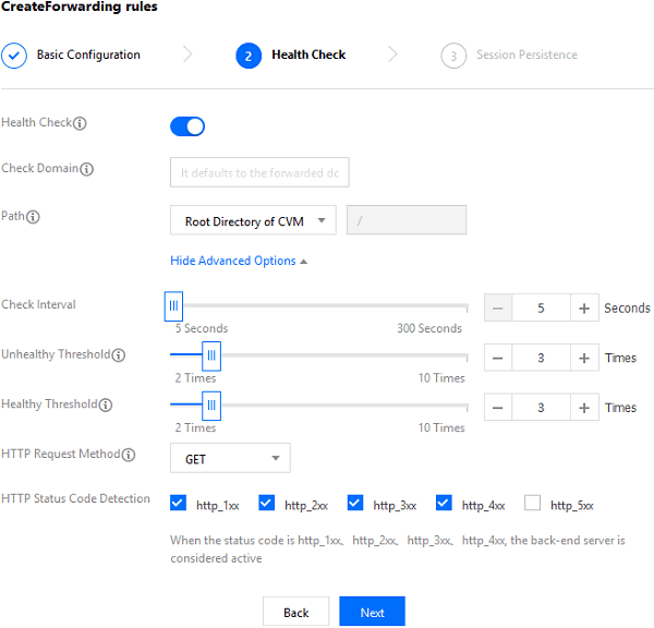 Verificação do código de status HTTP | Se o código de status for dos selecionados, o servidor de back-end é considerado ativo (íntegro). Intervalo de valores: http_1xx, http_2xx, http_3xx, http_4xx e http_5xx. | Vários estão selecionados: http_1xx, http_2xx, http_3xx e http_4xx. |