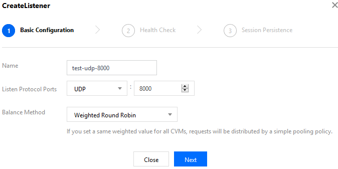 Protocolo do listener e porta de escuta | Protocolo do listener e porta de escuta. Protocolo do listener: o CLB aceita vários protocolos, incluindo TCP, UDP, HTTP e HTTPS. O UDP é usado neste exemplo. Porta de escuta: uma porta usada para receber solicitações e encaminhá-las para o servidor de back-end. Intervalo de portas: 1 a 65535. A porta do listener deve ser exclusiva na mesma instância do CLB. | UDP:8000 |
