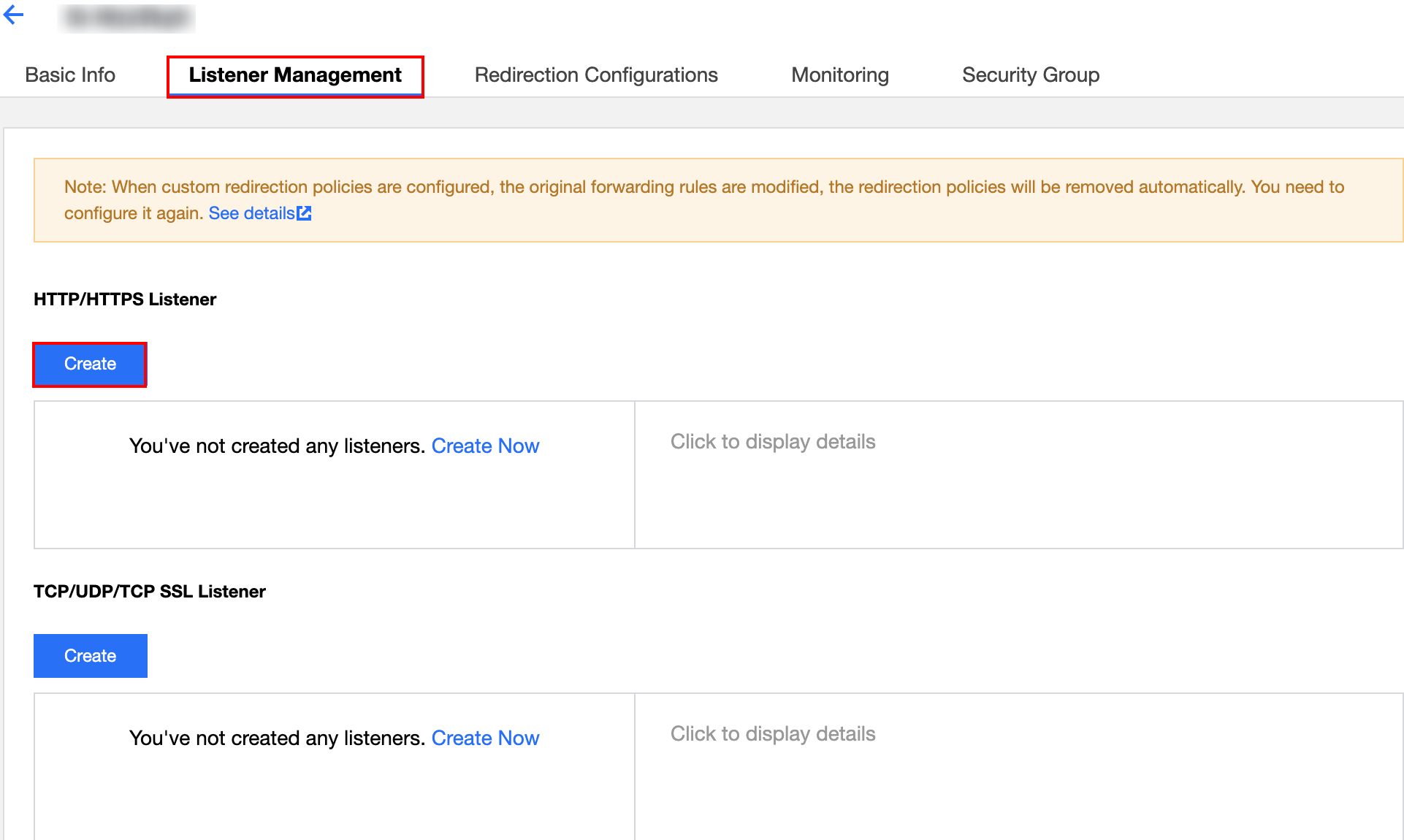 4. Em HTTP/HTTPS Listeners (Listeners HTTP/HTTPS) em "Listener Management" (Gerenciamento de listener), clique em Create (Criar) para criar um listener do CLB.