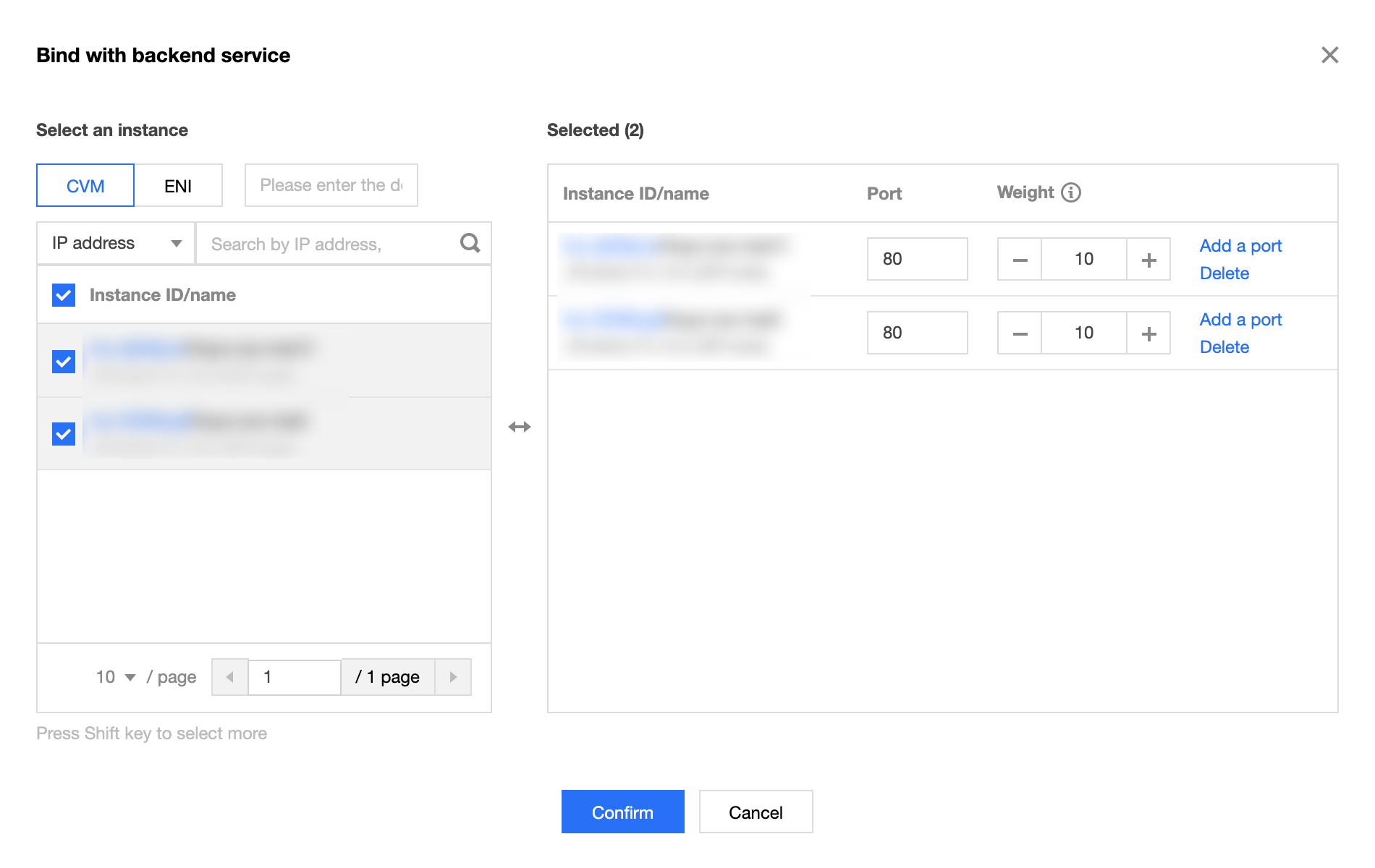 2. Na caixa pop-up, selecione a instância do CVM, defina a porta de serviço Nginx padrão para 80, defina o peso (10 por padrão) e clique em OK.